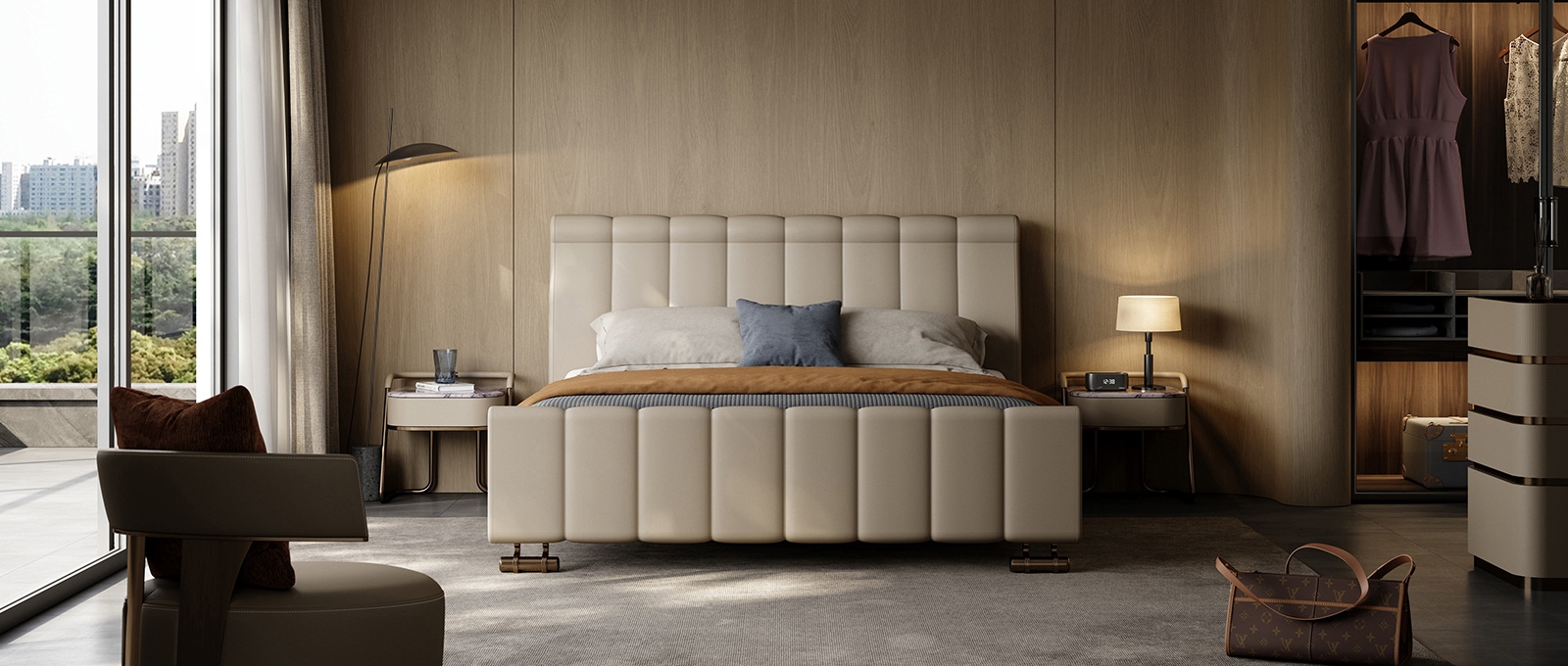 The countertop is made of natural rock slabs with a unique texture like an art painting. After high-temperature calcination and anti-seepage treatment, it is wear-resistant and stain-resistant with its own quiet luster. The cabinet body is wrapped in delicate leather, which feels warm and skin-friendly, complementing the tough lines of the metal base.