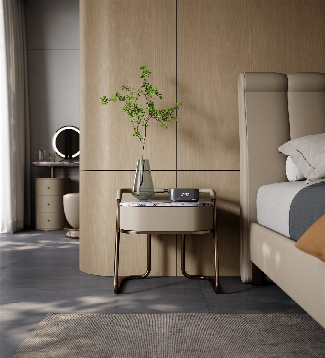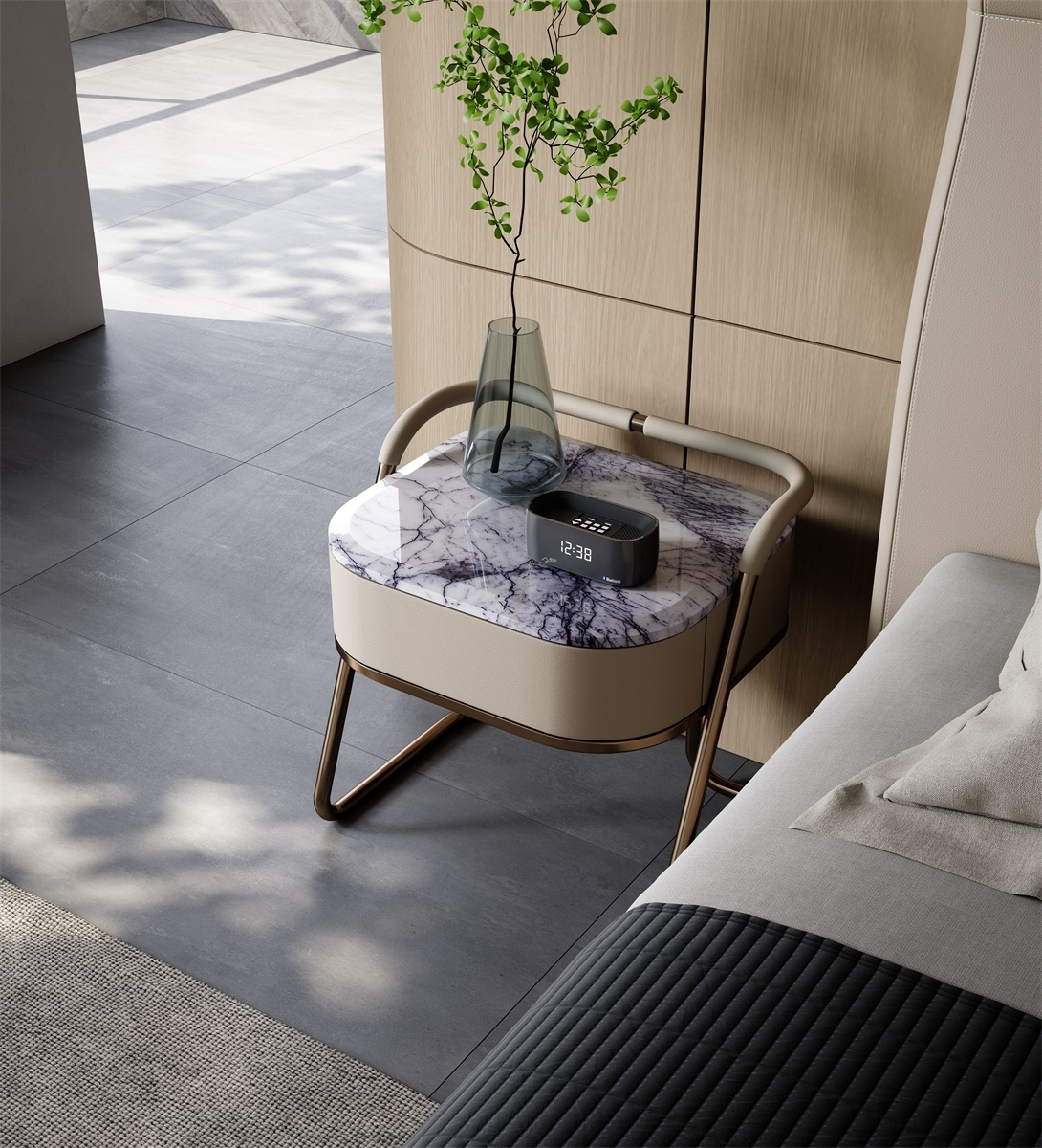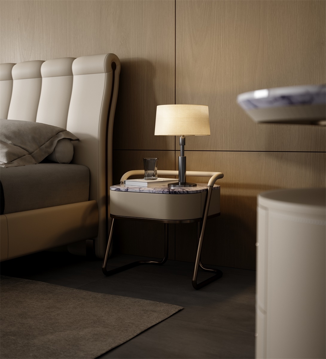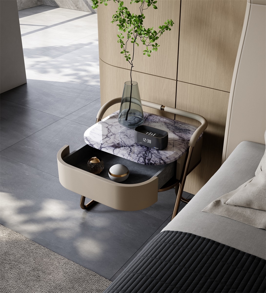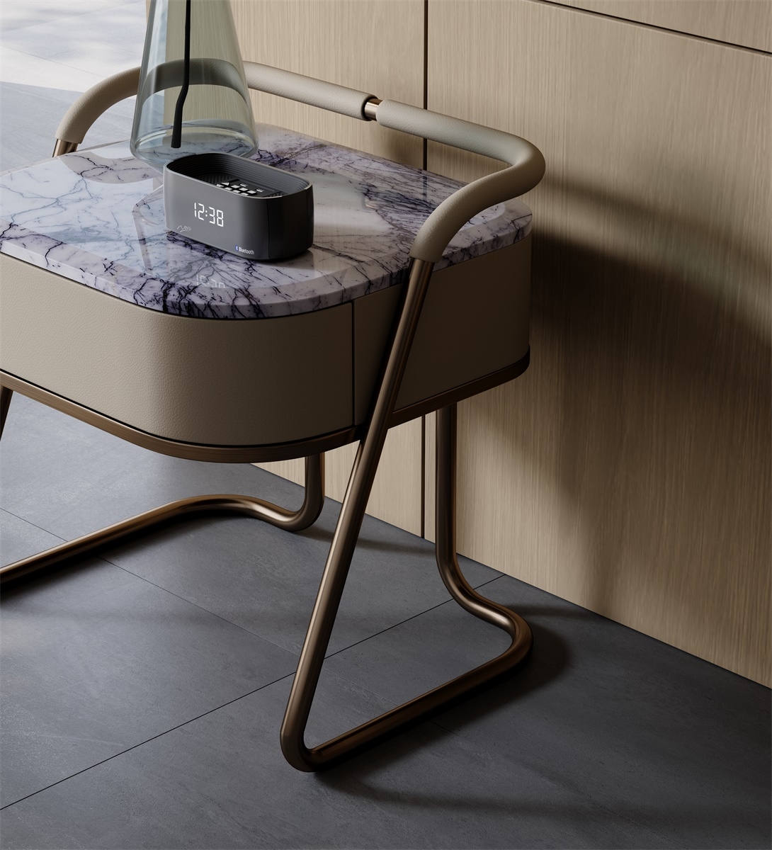 A lightweight metal bedside table with a touch of luxury due to its luxurious stone material. The slender metal wrapped in leather gives a sense of solemnity while maintaining individuality.