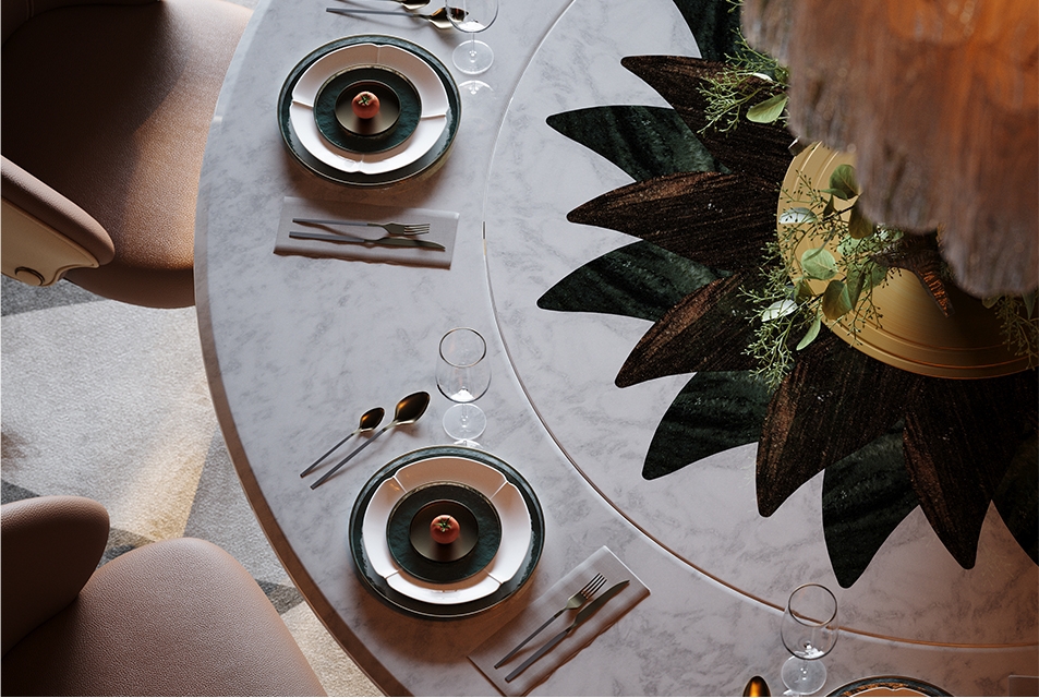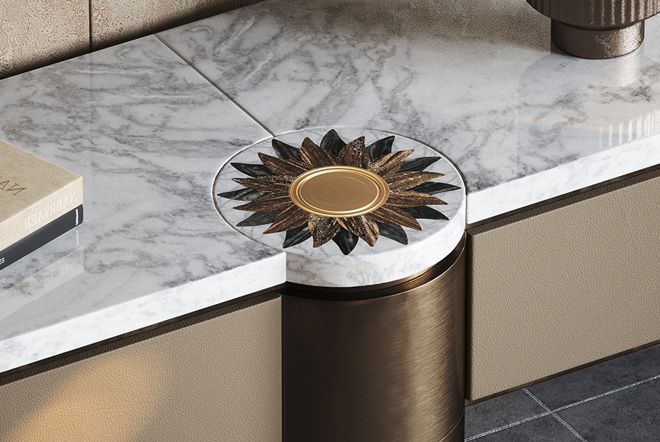 Magnificent preface, time is extreme, with artistic flowers as the interface,Using light and natural luxury stone colors, draw the divine shape of a golden sunflower,Not only does it symbolize the intergenerational inheritance of the family, but it is also a unique totem that silently tells the noble identity of the residents and the extraordinary value of the mansion itself.