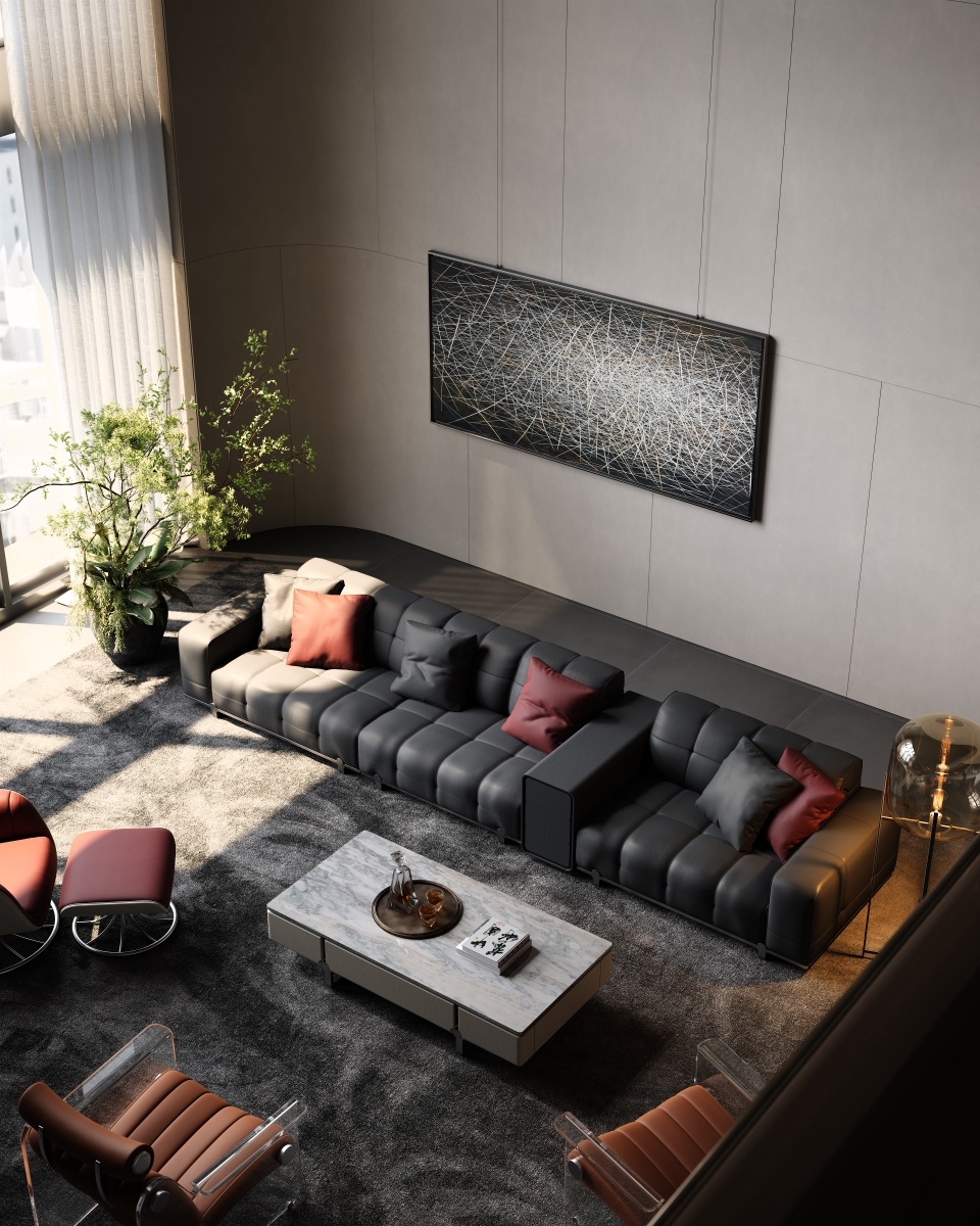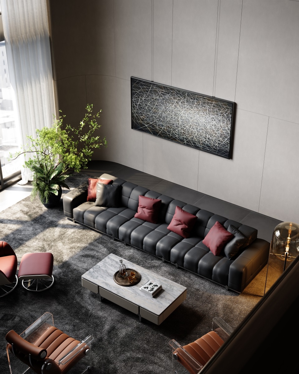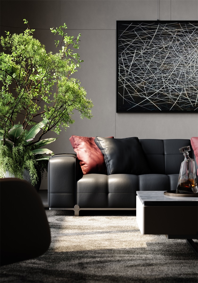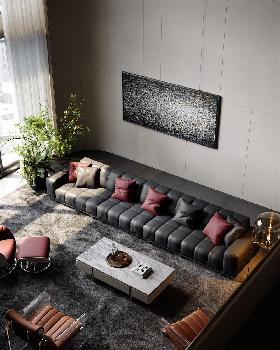 With simple geometric shapes, modules complement each other, like versatile building blocks, freely combining forms, endowing the magic of spatial transformation. Durable, cozy black leather offers a sumptuous touch and timeless appeal.Red pillows add a bold pop of color and visual interest.Clean lines and tailored cushions create an elegant, sophisticated look.