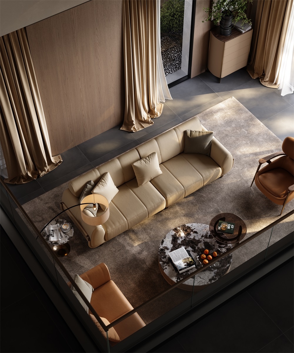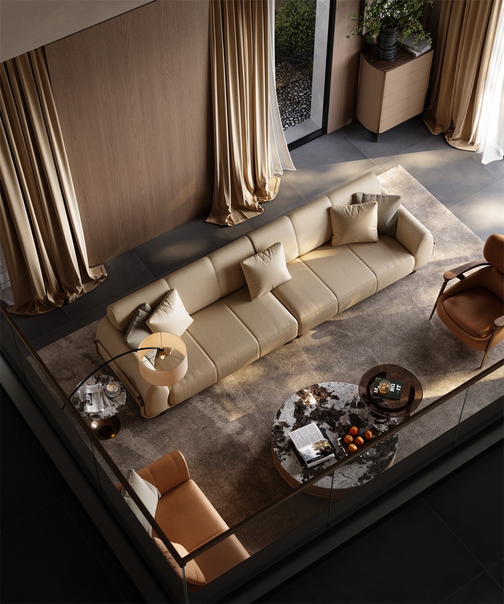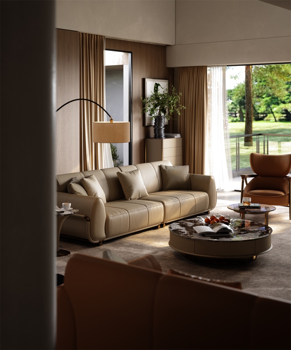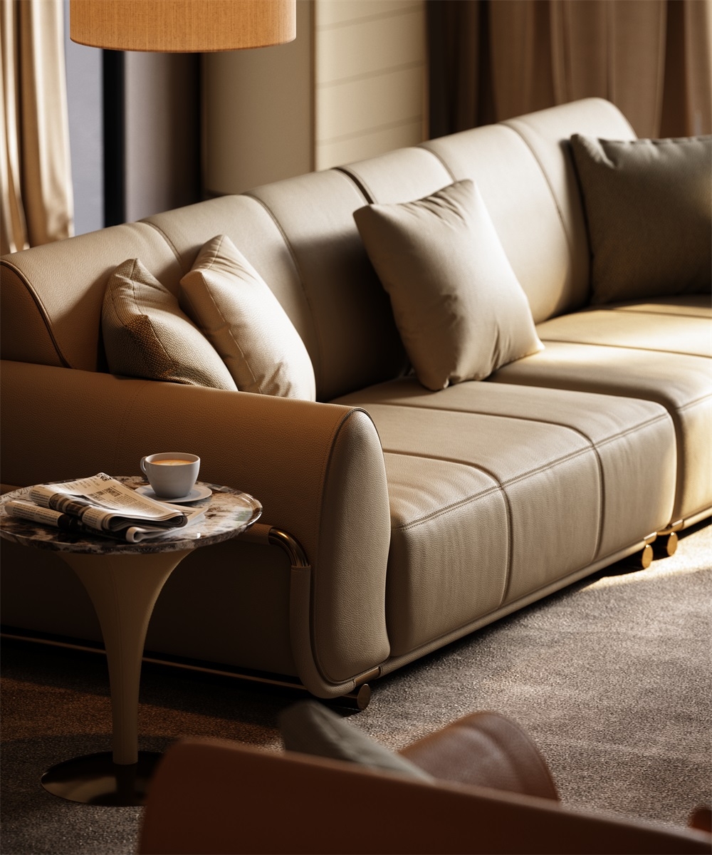 The sofa stitching is made of imported gold thread from Italy, hand-spun by a workshop along the shore of Lake Como. With a 12-needle per inch tight sewing process, it not only makes the leather splicing unbreakable but also Outlines exquisite geometric patterns on the surface of the sofa. When the slanting light shines, the gold threads will emit a delicate metallic luster, creating an interplay of light and shade with the matte texture of the leather, transforming the "detail-oriented" craftsmanship into flowing art in the living room