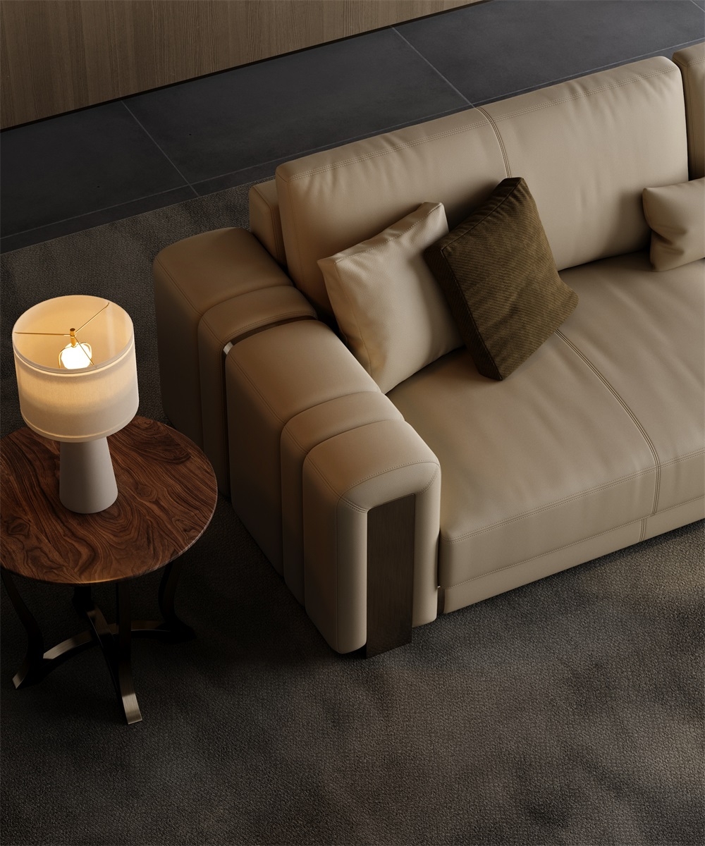 The armrest is embedded with metal blocks, making it more stable and modern, breaking the solid color of the sofa.