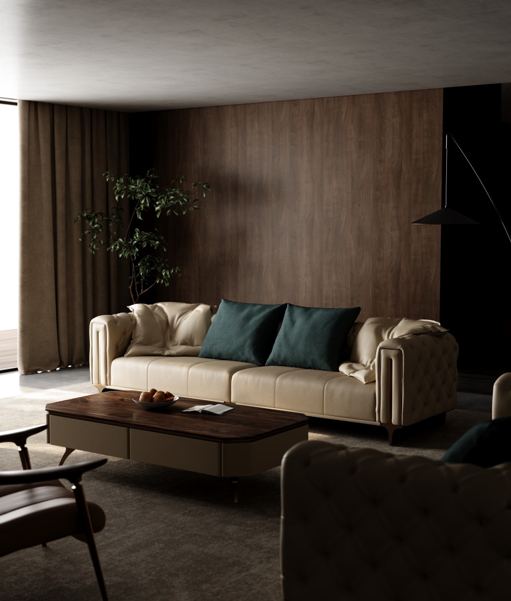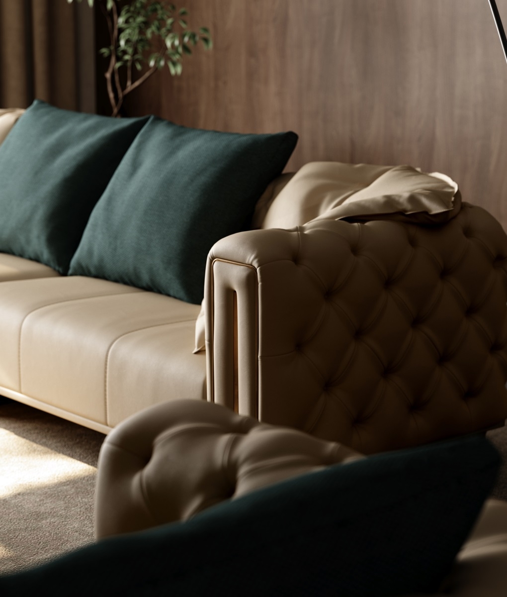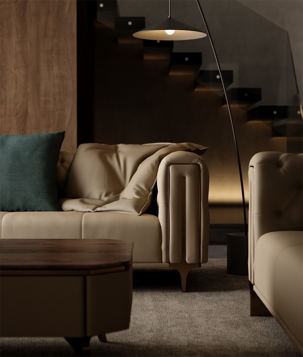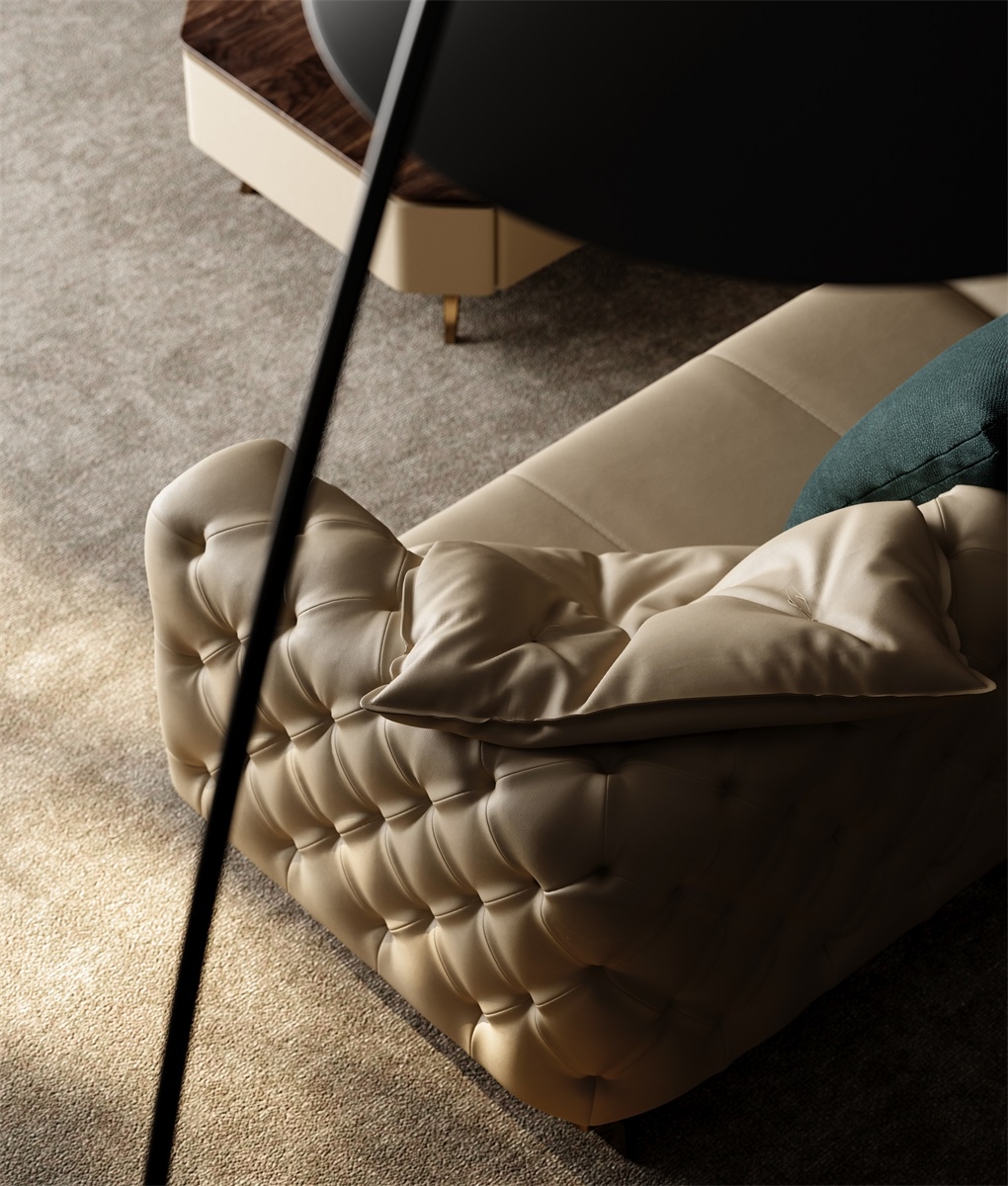 Taking the classical nail buckle as the prototype, but transforming it like the surface of the moon, reinterpreting the buckle technique, making the buckle cover the entire structure of the sofa work and achieve balance with the appearance.