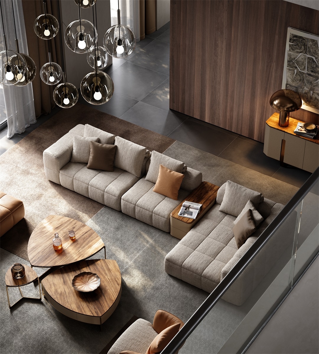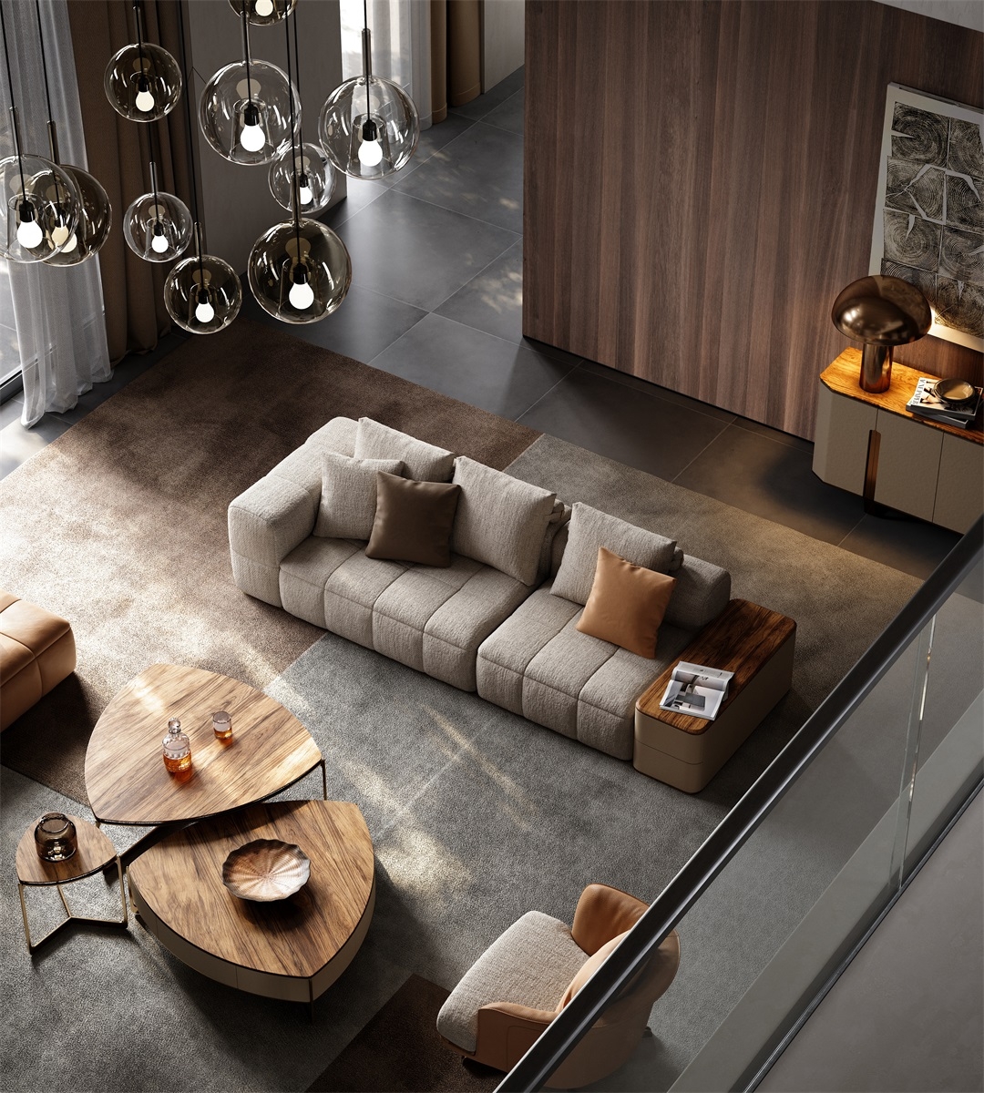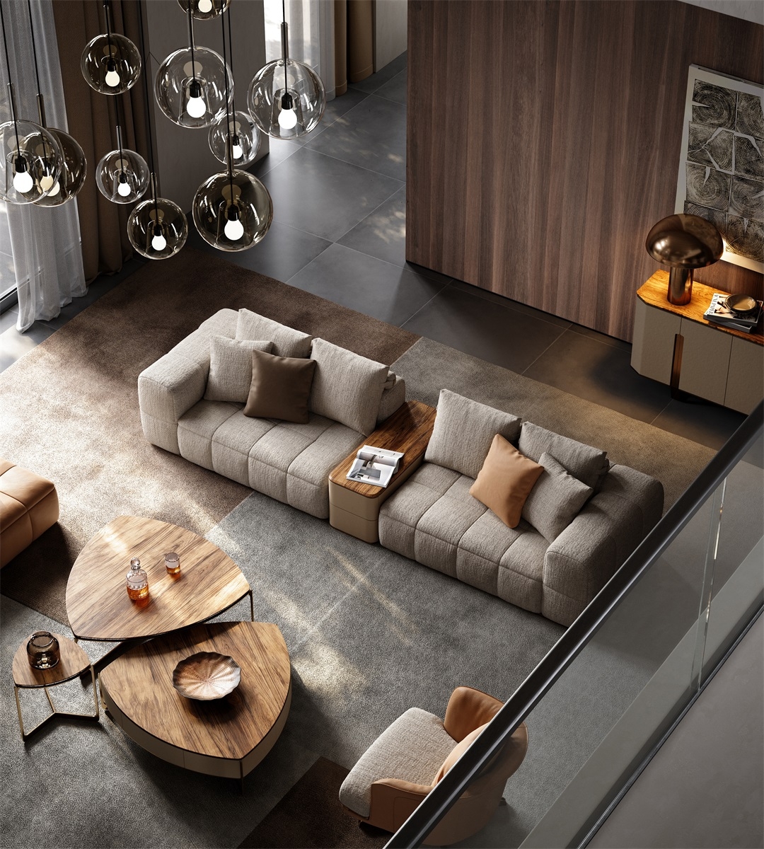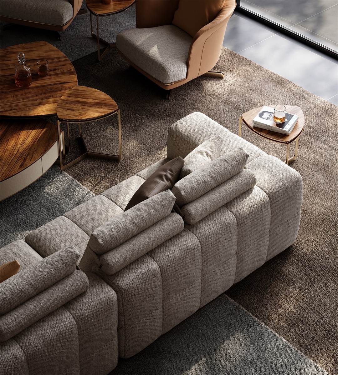 The innovative module design allows for free splicing and combination, adapting to different spatial forms. The small side table provides practical storage functions, making the layout more flexible. The full-bodied backrest and square-shaped design, combined with the exquisite embellishment of the metal base, are both aesthetically pleasing and comfortable.