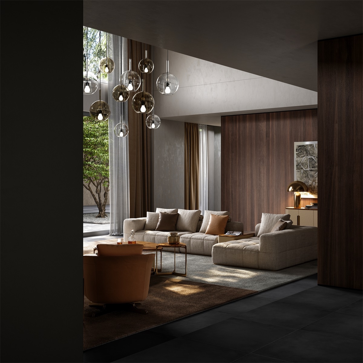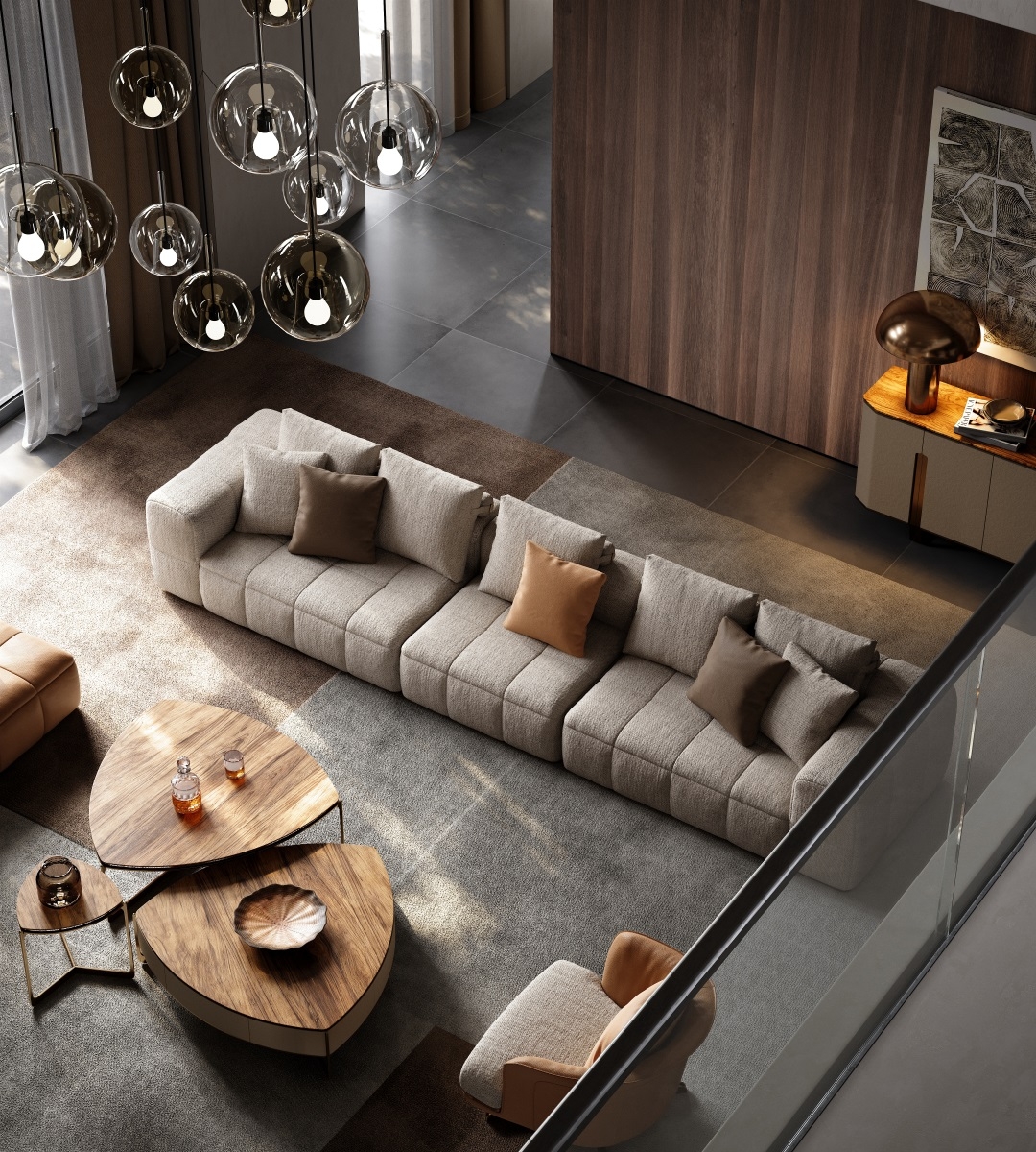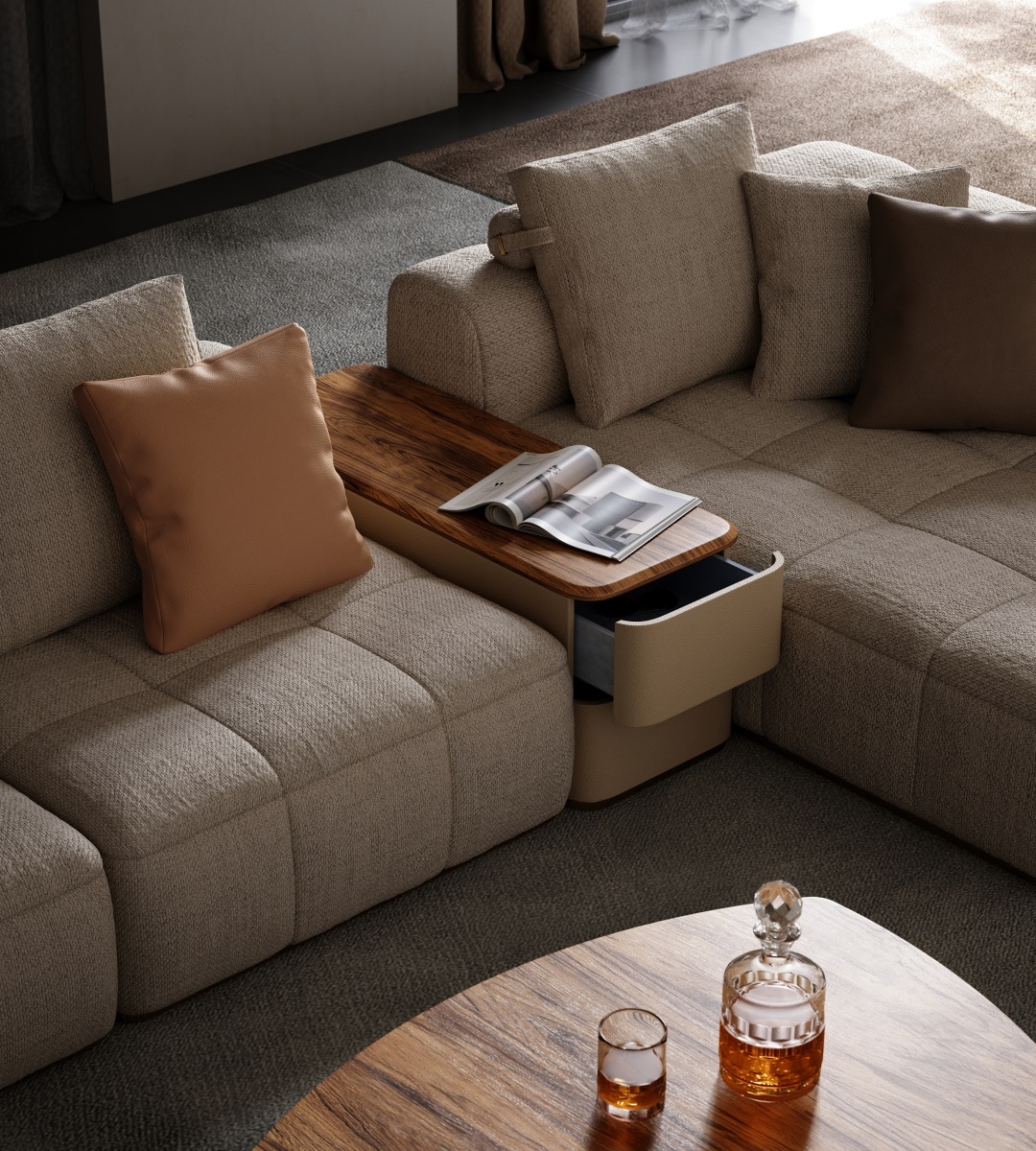 The innovative module design allows for free splicing and combination, adapting to different spatial forms. The small side table provides practical storage functions, making the layout more flexible. The full-bodied backrest and square-shaped design, combined with the exquisite embellishment of the metal base, are both aesthetically pleasing and comfortable.