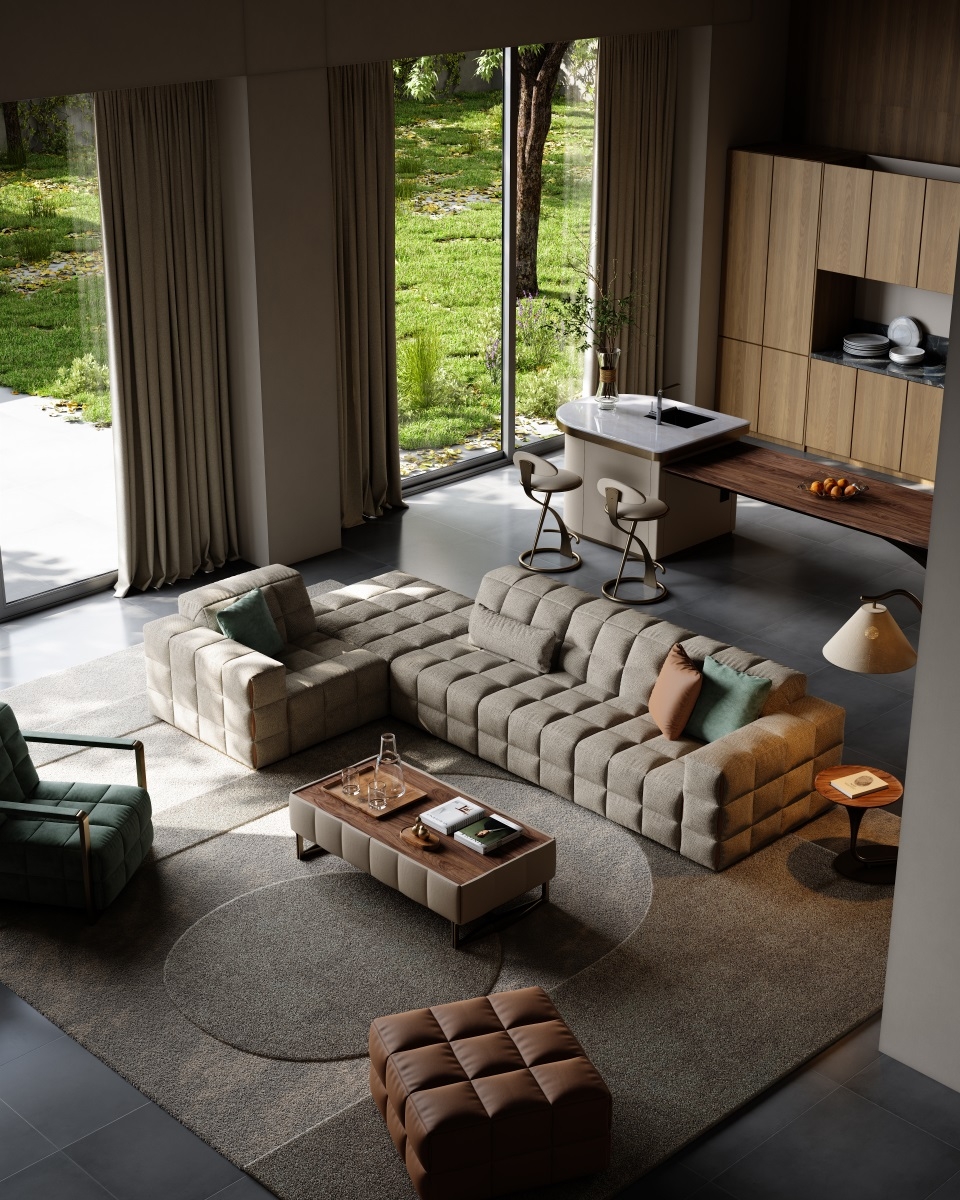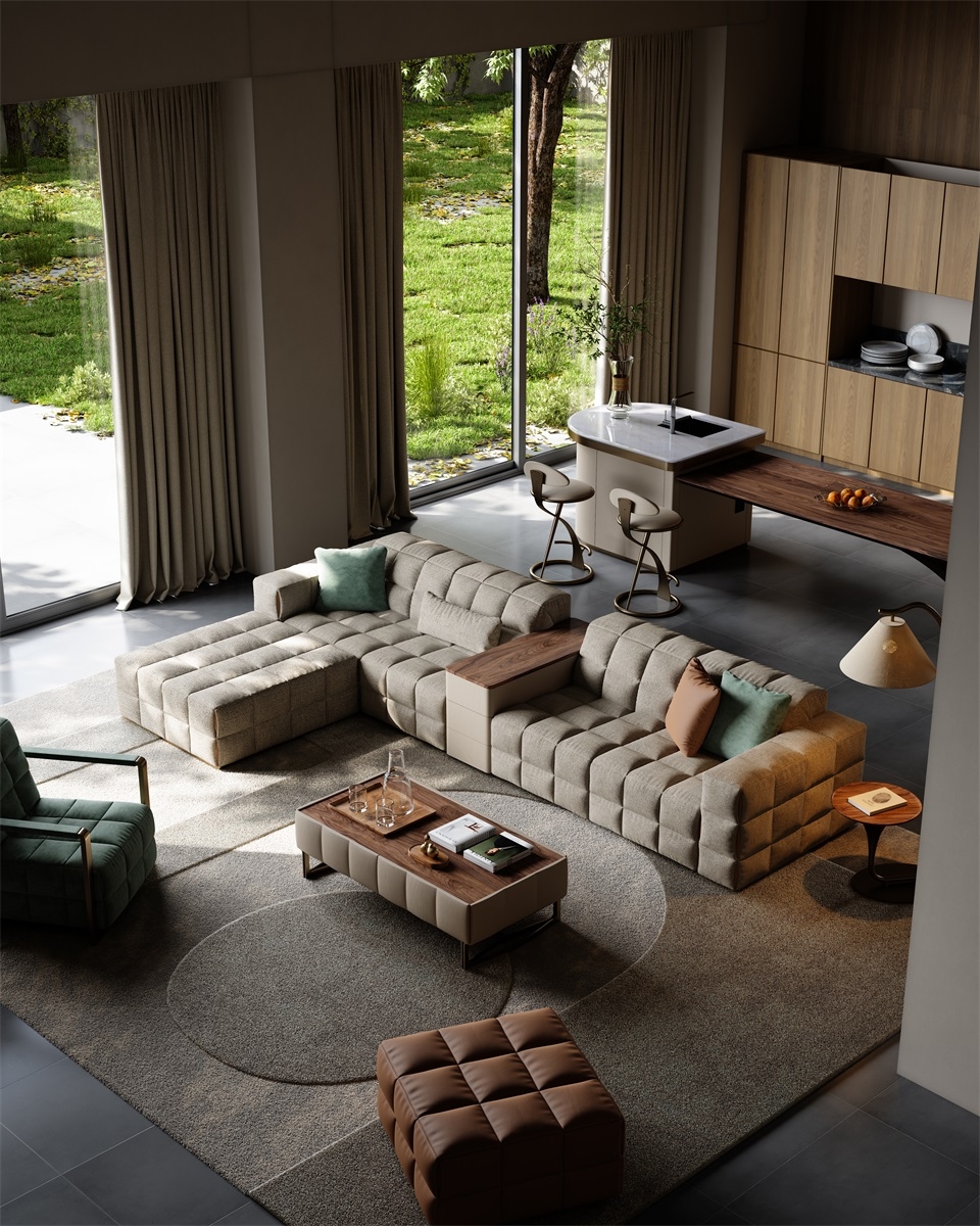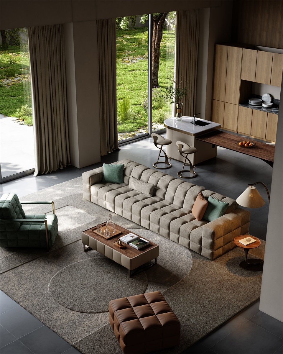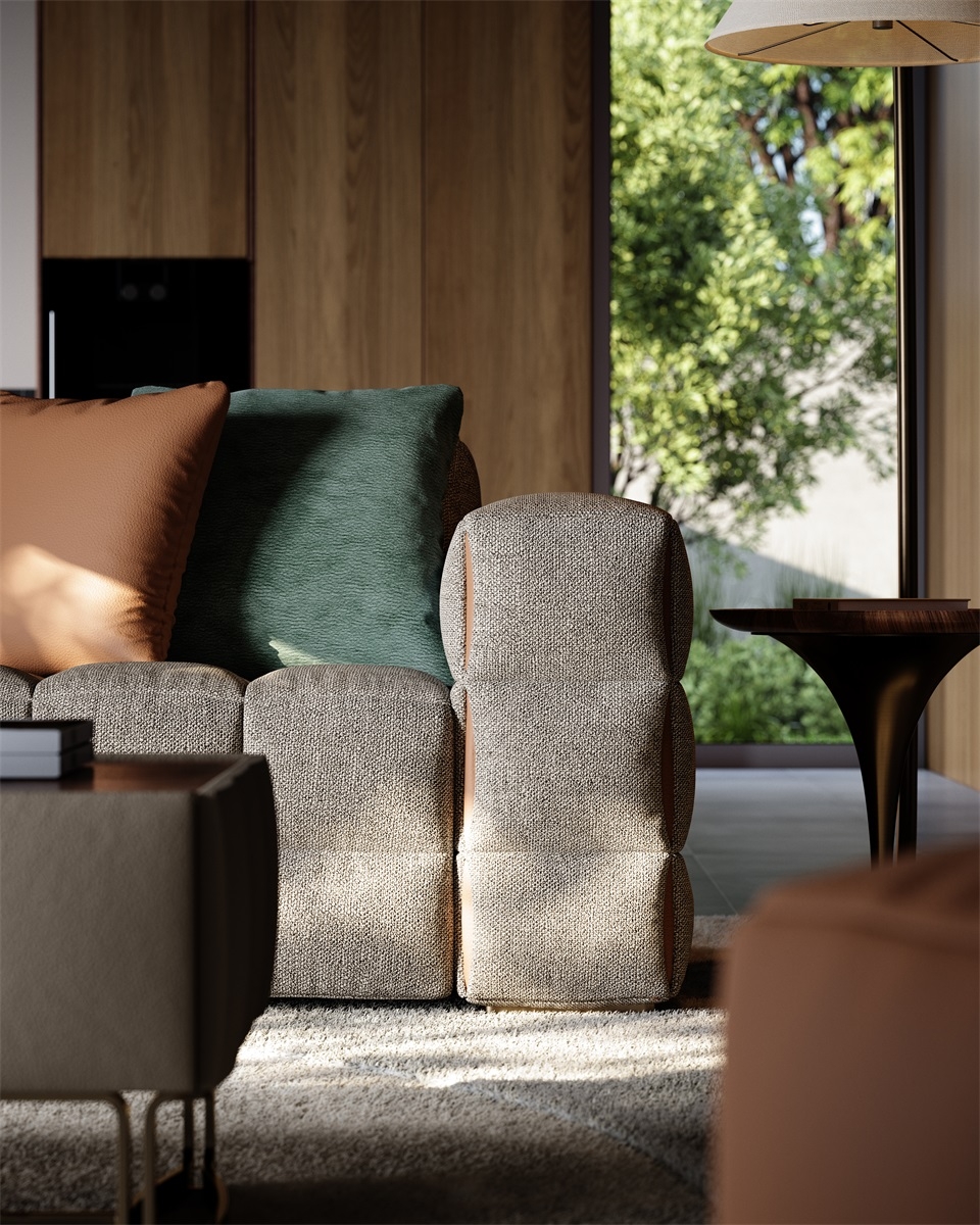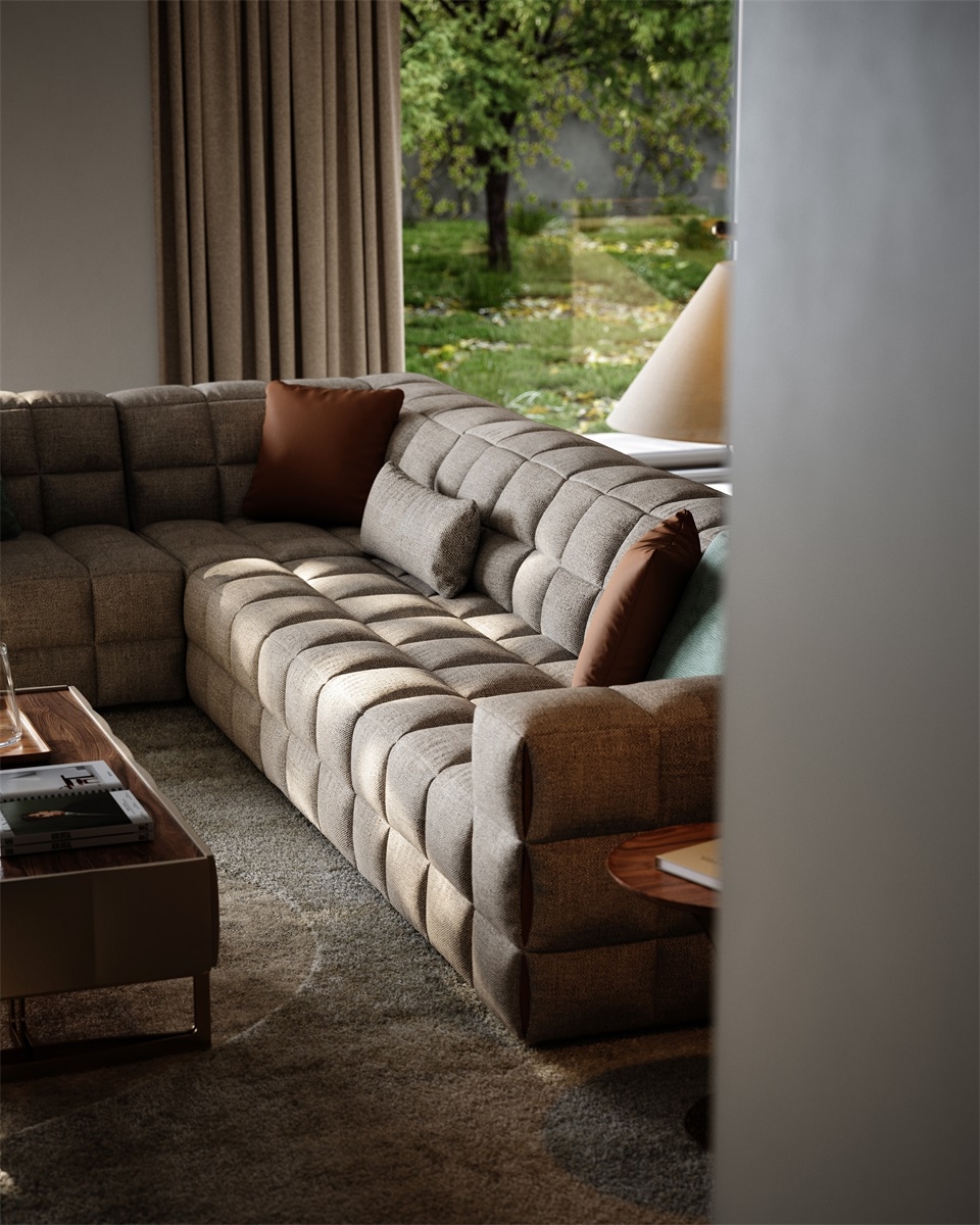The sofa as a whole is more full and three-dimensional under the outline of grid elements, and the functional positions bring just the right comfortable sitting feeling. The folding and sewing process at the details adds a touch of fashion.