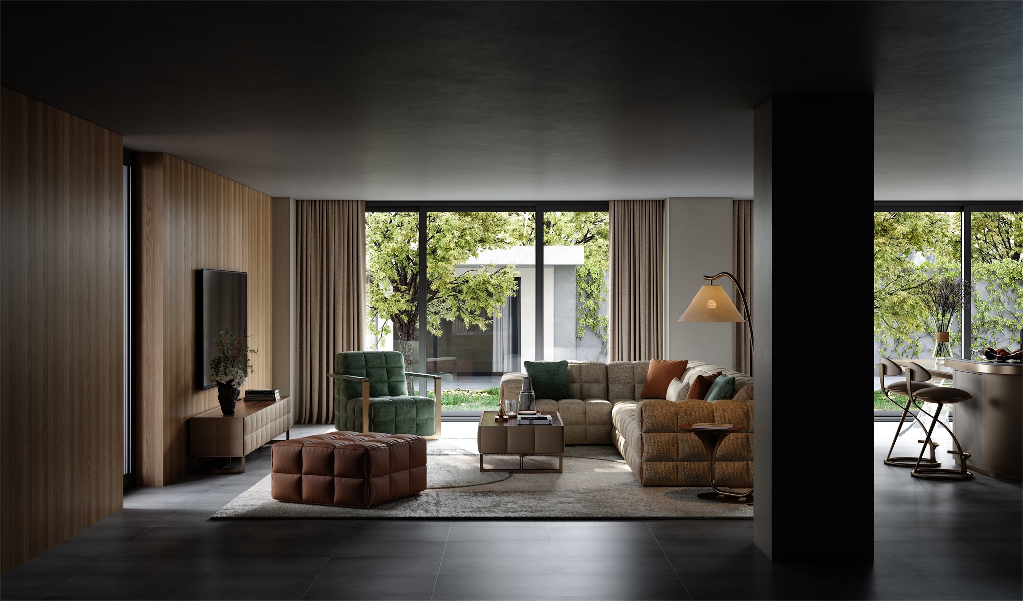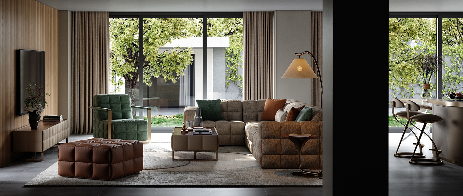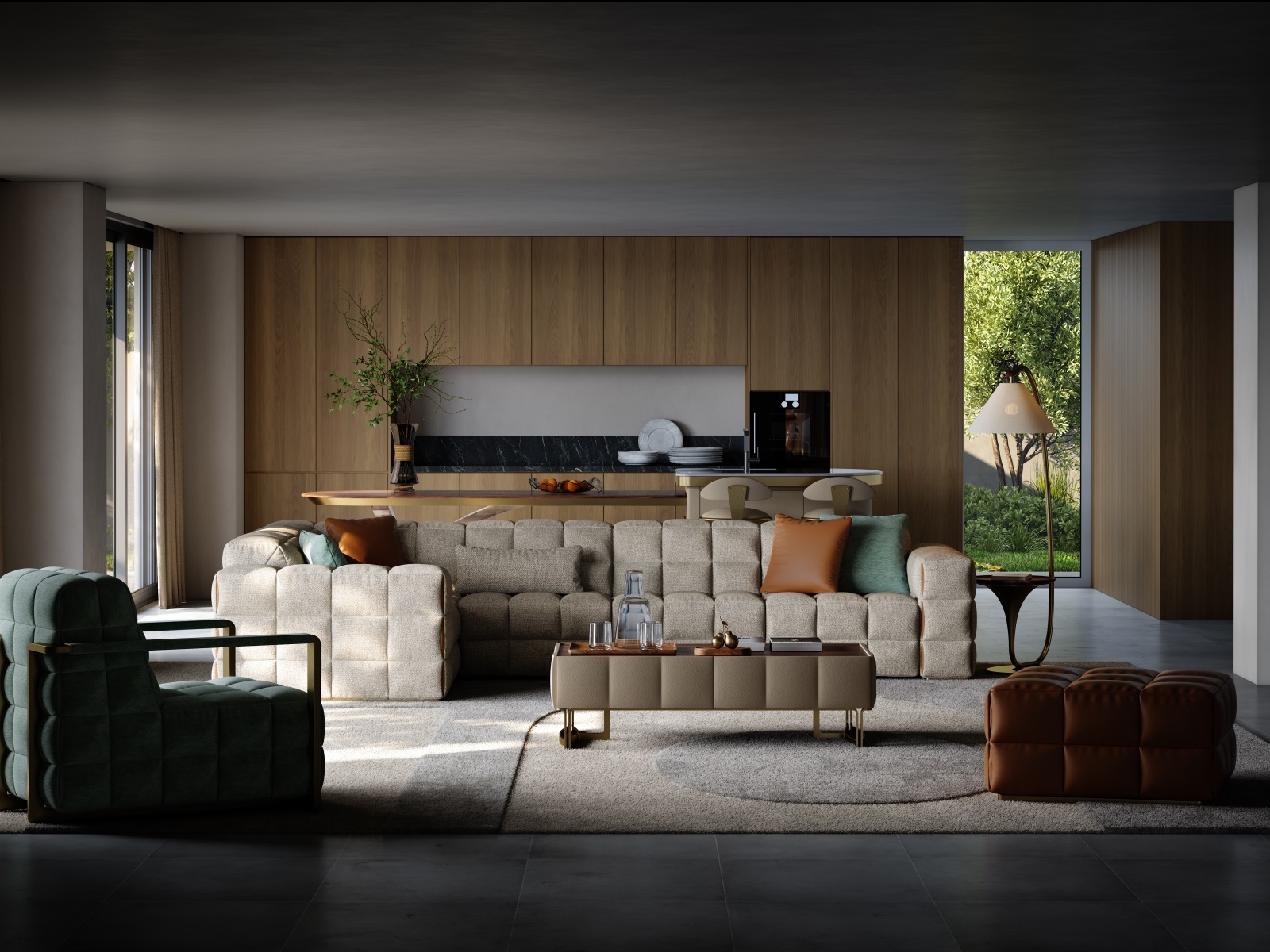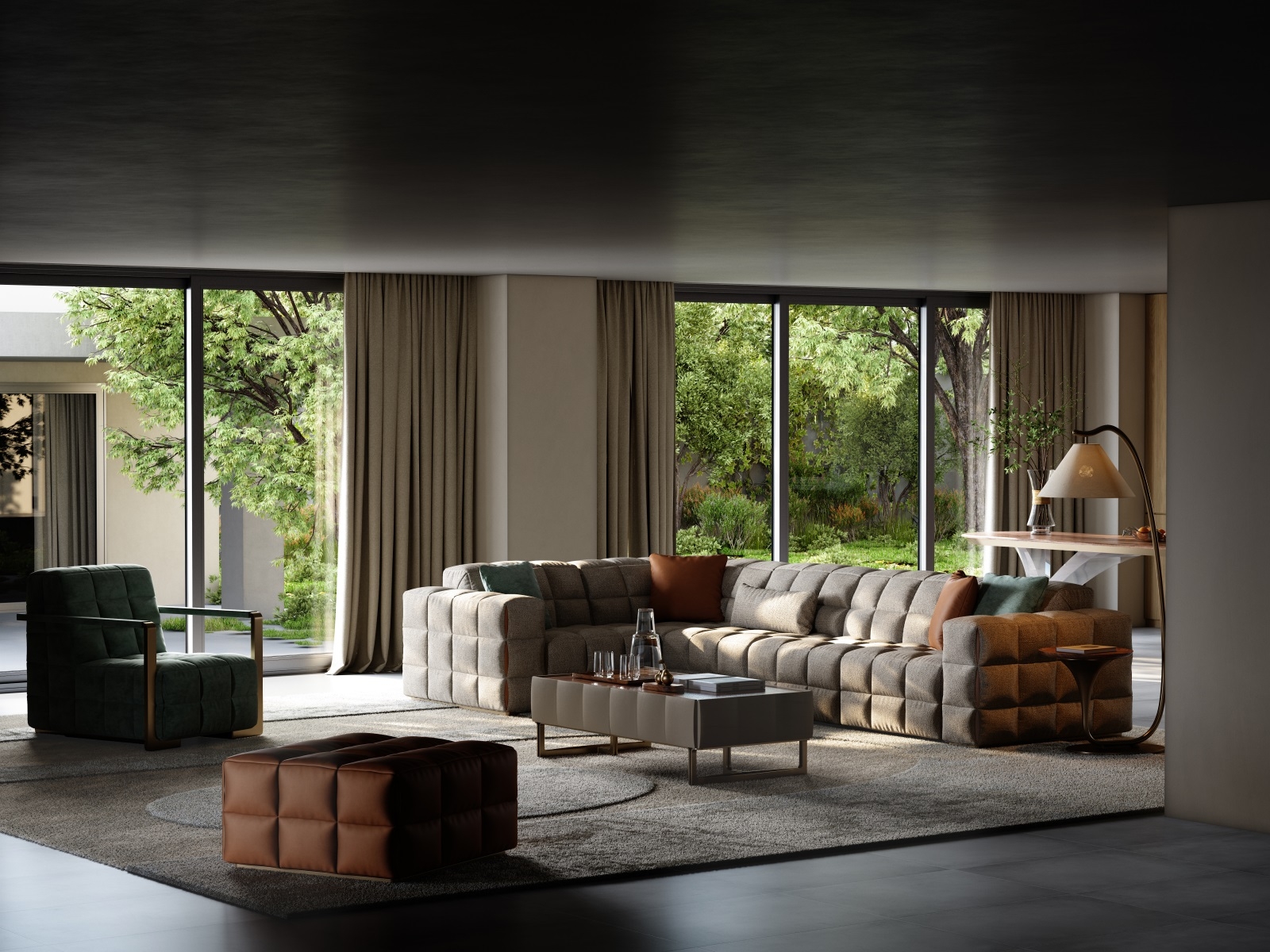 The sofa as a whole is more full and three-dimensional under the outline of grid elements, and the functional positions bring just the right comfortable sitting feeling. The folding and sewing process at the details adds a touch of fashion.