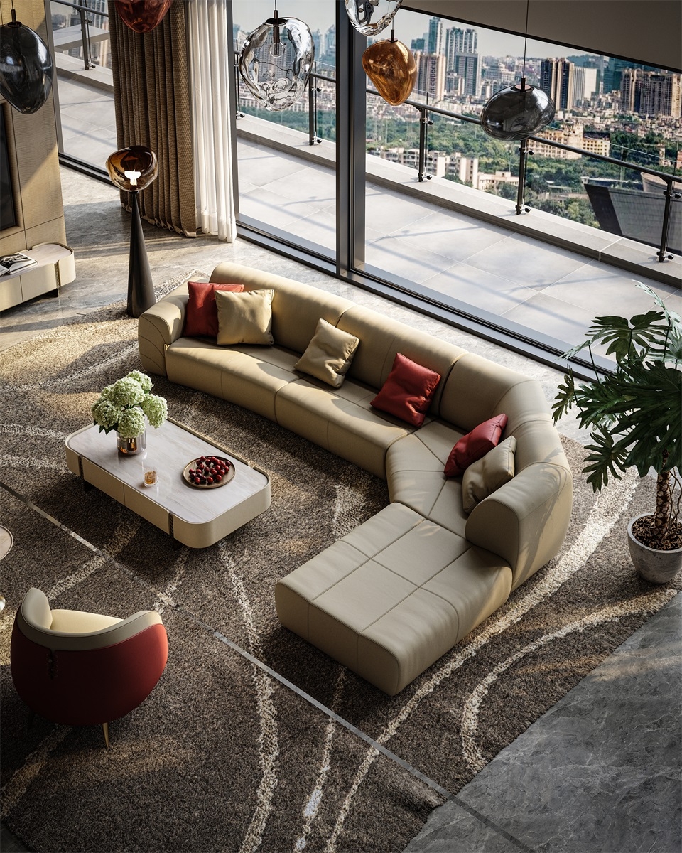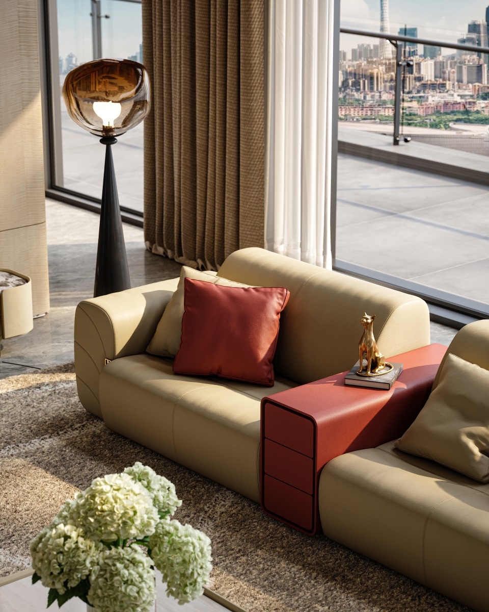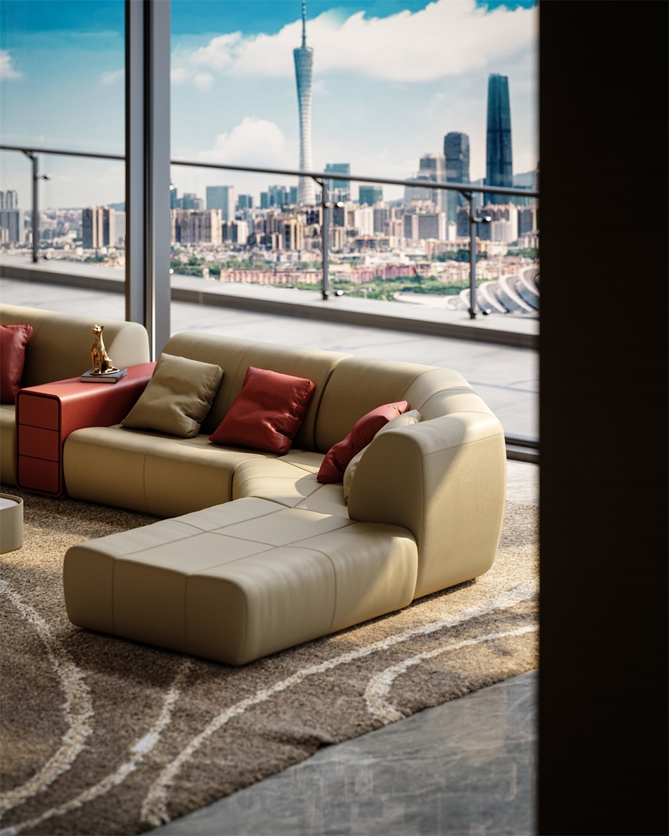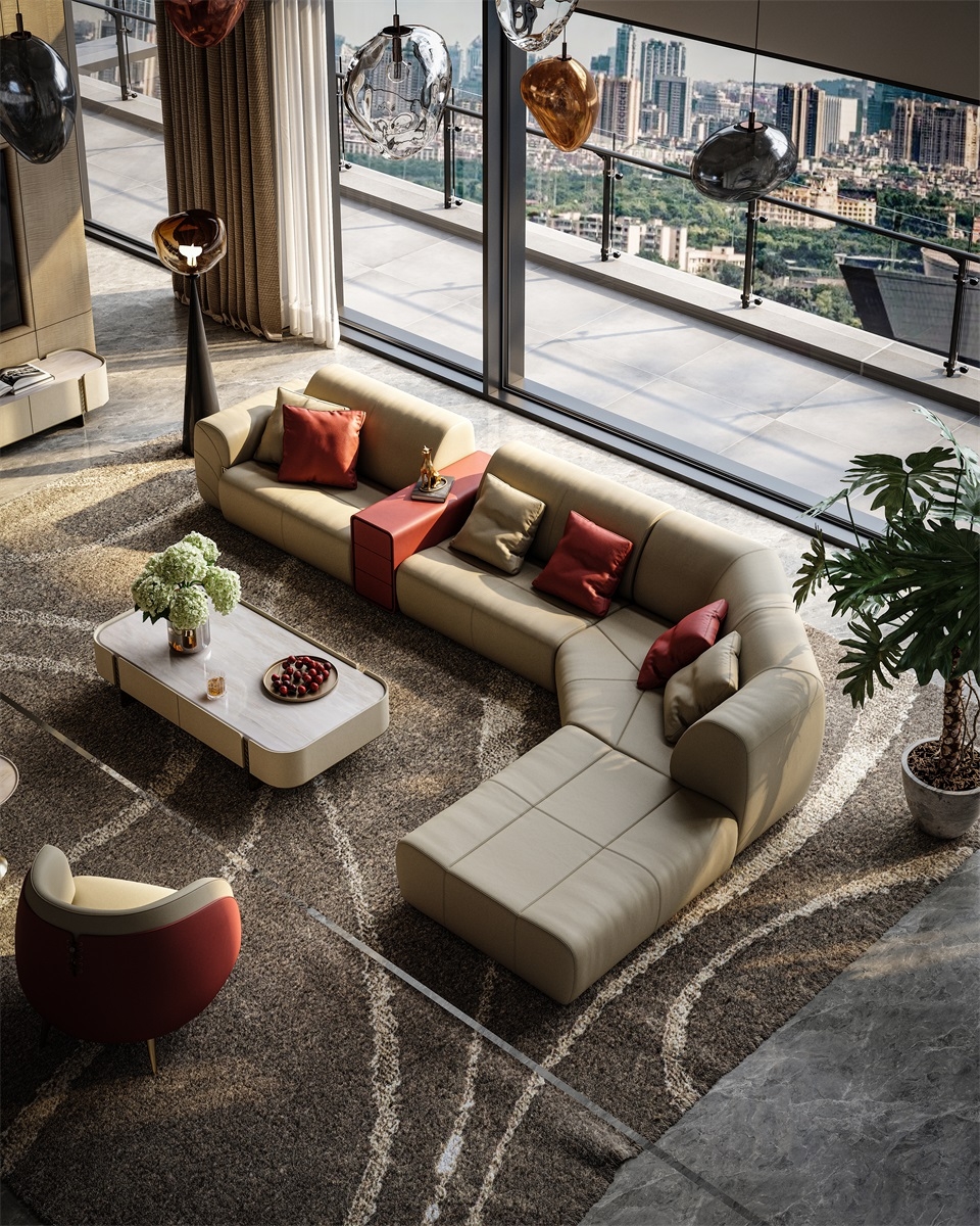Modern minimalist genuine leather sofa with distinct layers of dark and light contrasting colors. It balances appearance and comfort with plump filling and smooth lines. The modular design is flexible and versatile. The texture of natural genuine leather fully demonstrates low-key luxury and a quality life.