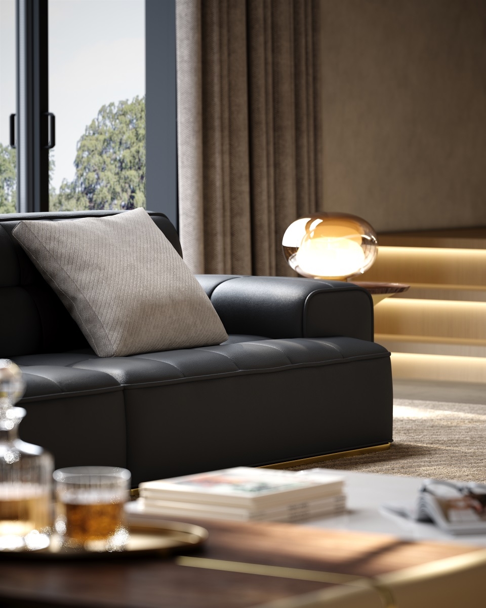 The design is simple and square, yet practical. It is neat and tidy, and the space is planned in an orderly manner. The space utilization rate is beyond your imagination.Features a black leather finish with a tufted design. Gold accents on the base add a touch of luxury, creating a bold, contemporary look.