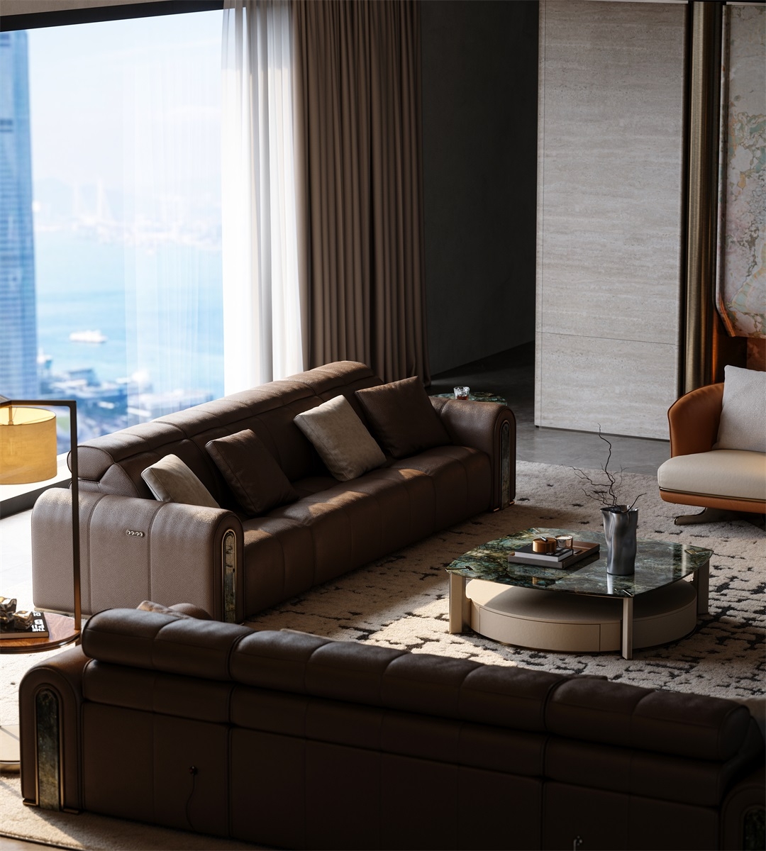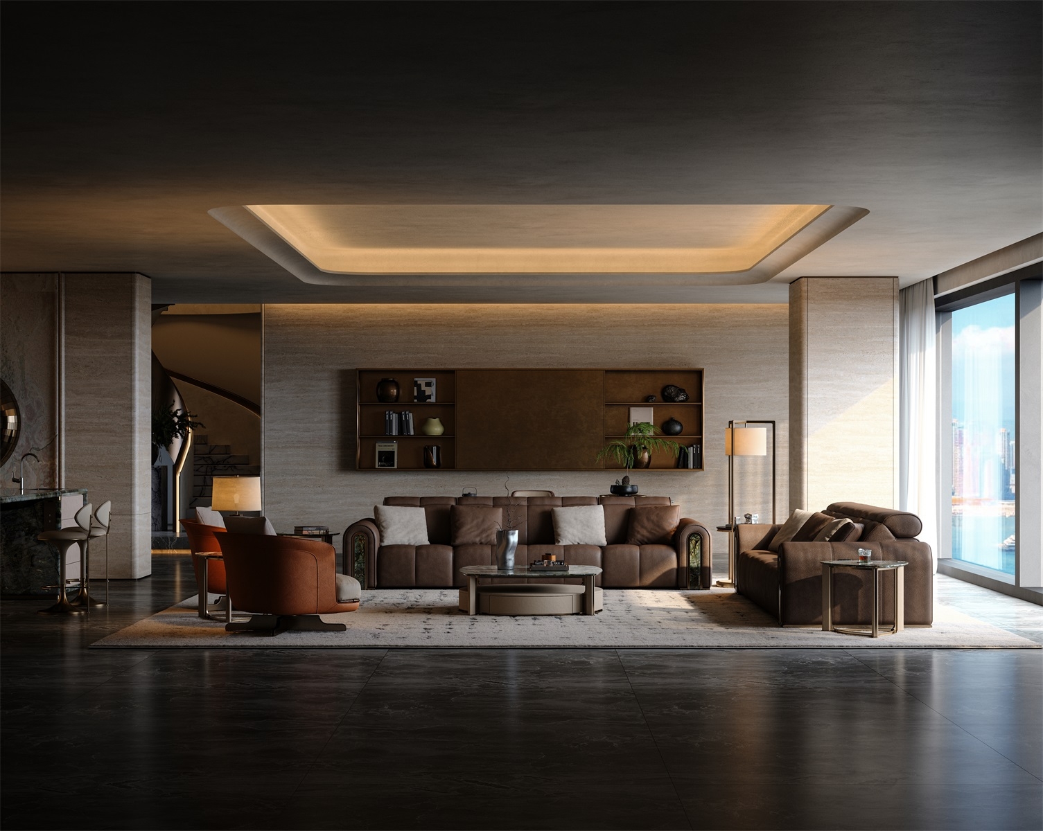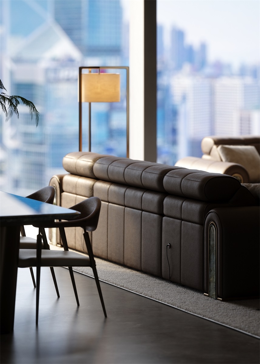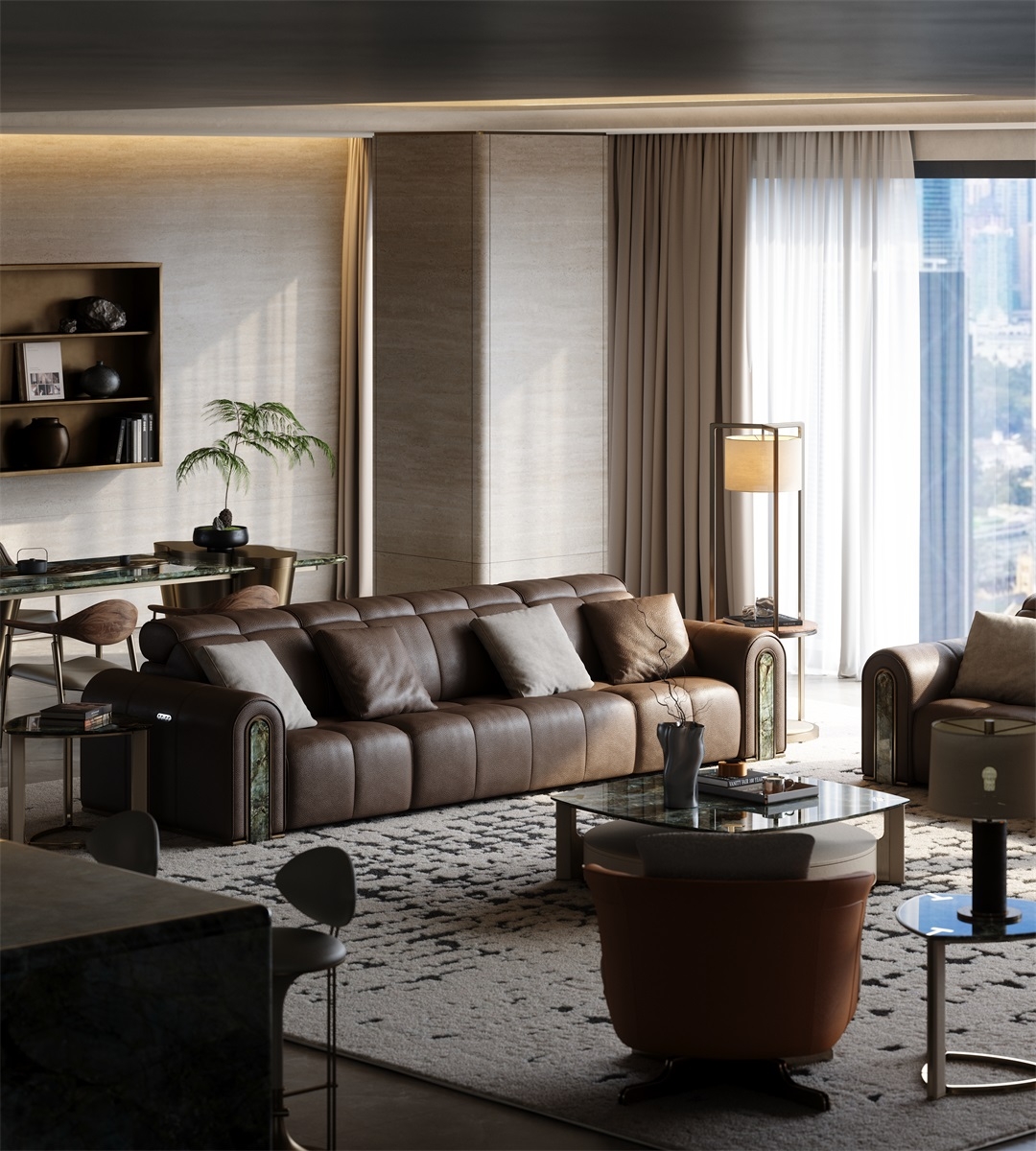 Through the interplay of diverse materials, it merges composure and capability with modern,