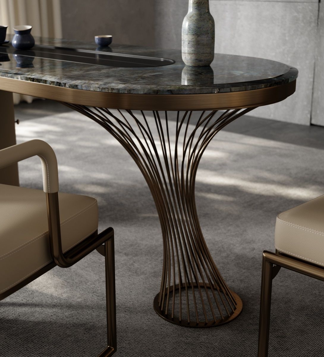 The metal base, elegantly clustered together, supports the desktop in the refracted light and shadow changes of the curved surface, emitting charming vitality.