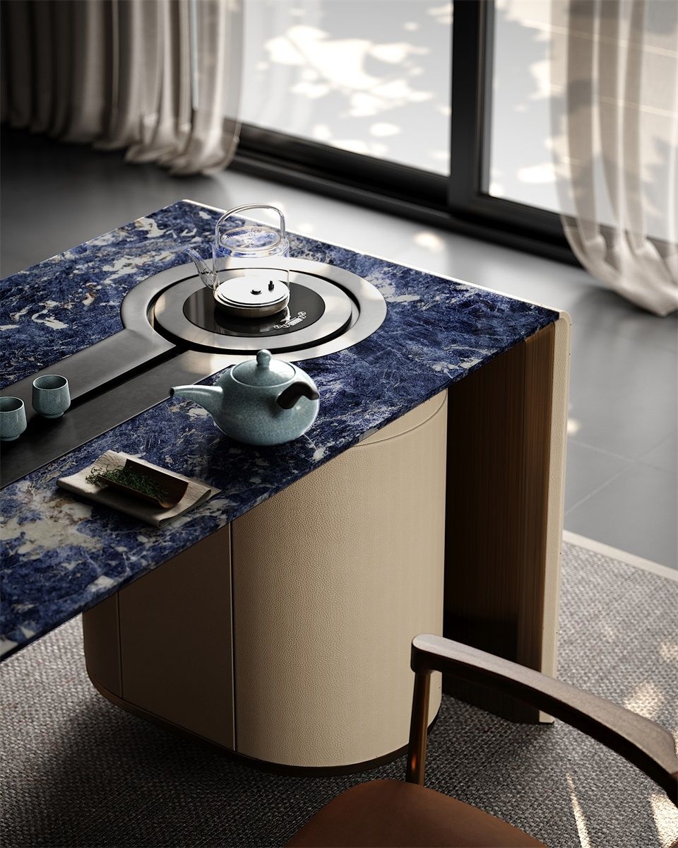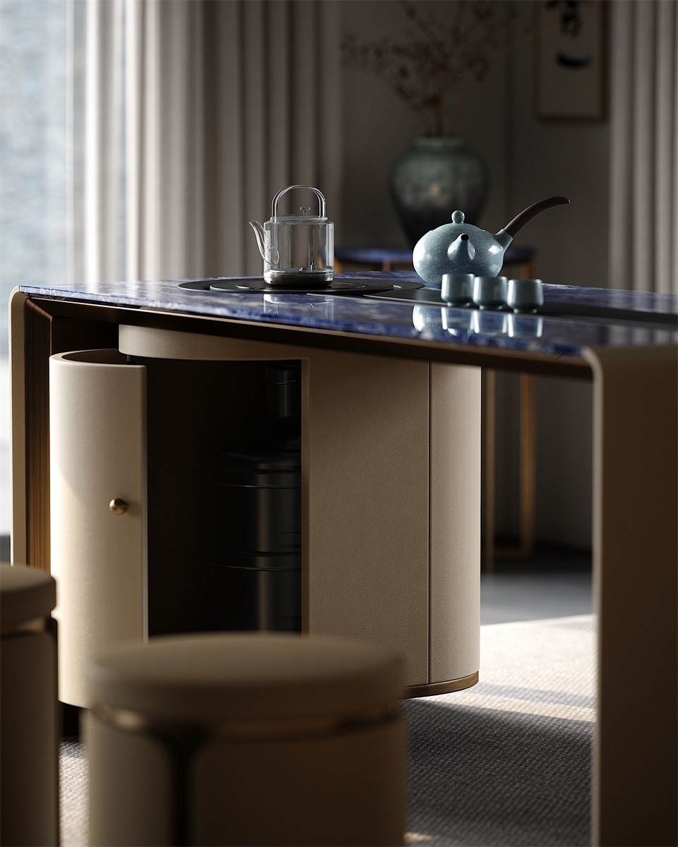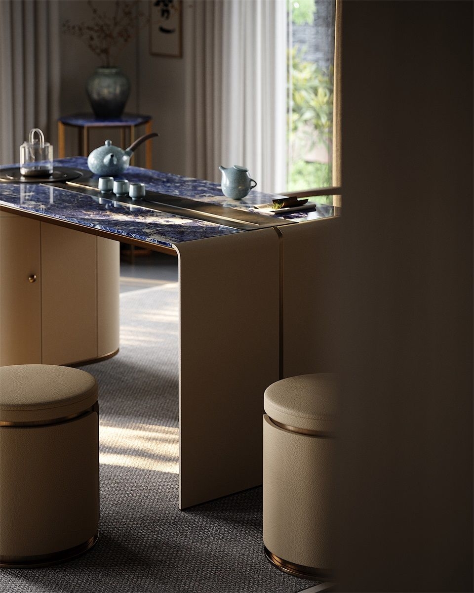 Without deliberately showing off, it has a kingly demeanor, making every return home like climbing to the top of Kunlun Mountain, feeling the magnificence and glory of China.Luxury Material Collocation:Blue marble tabletop, beige fabric - wrapped cabinets, and metal trim blend to create a high - end, elegant look.Smart Storage Integration:Built - in curved cabinet offers convenient storage for tea sets, keeping the space tidy.