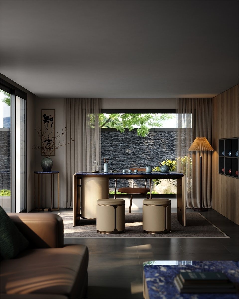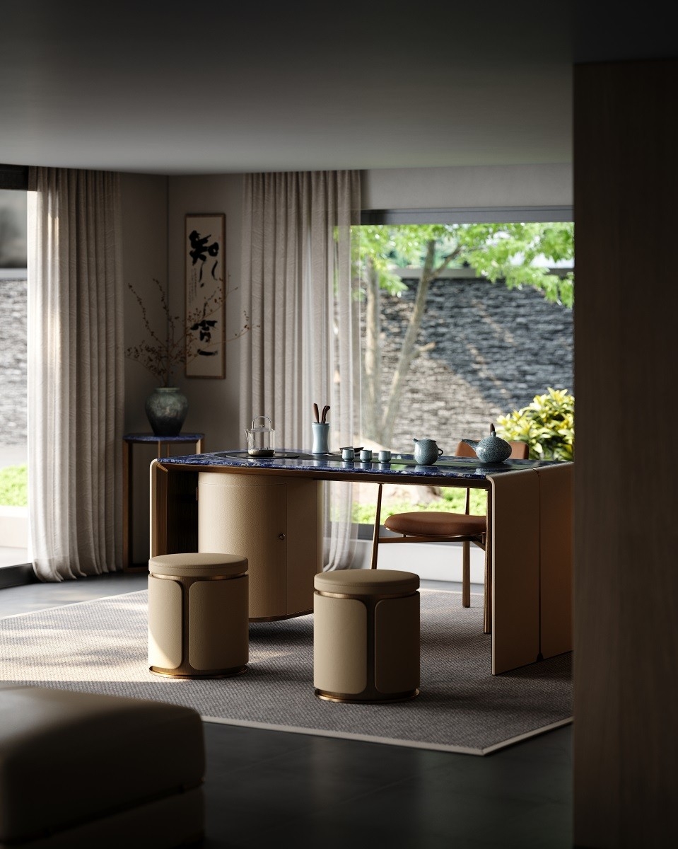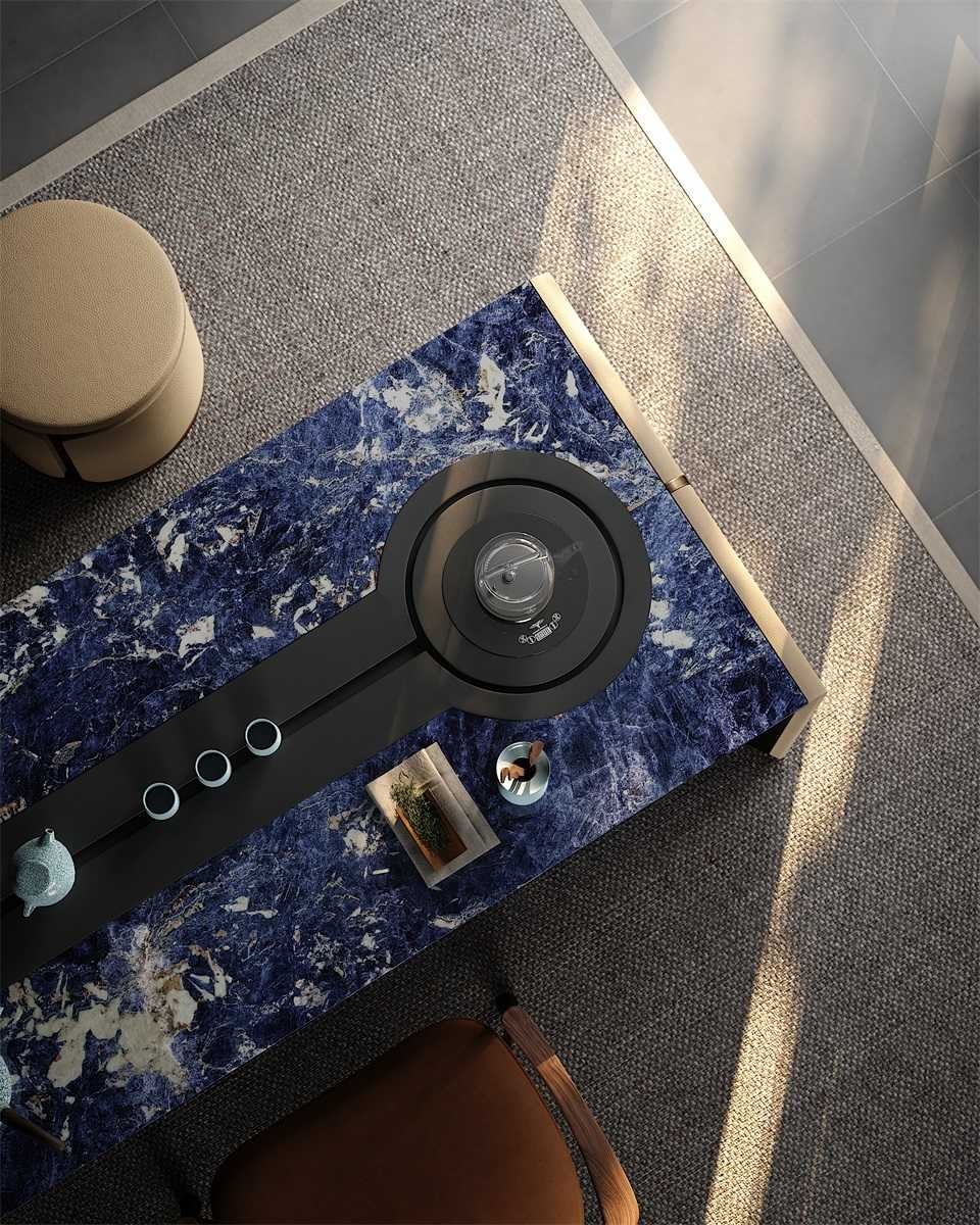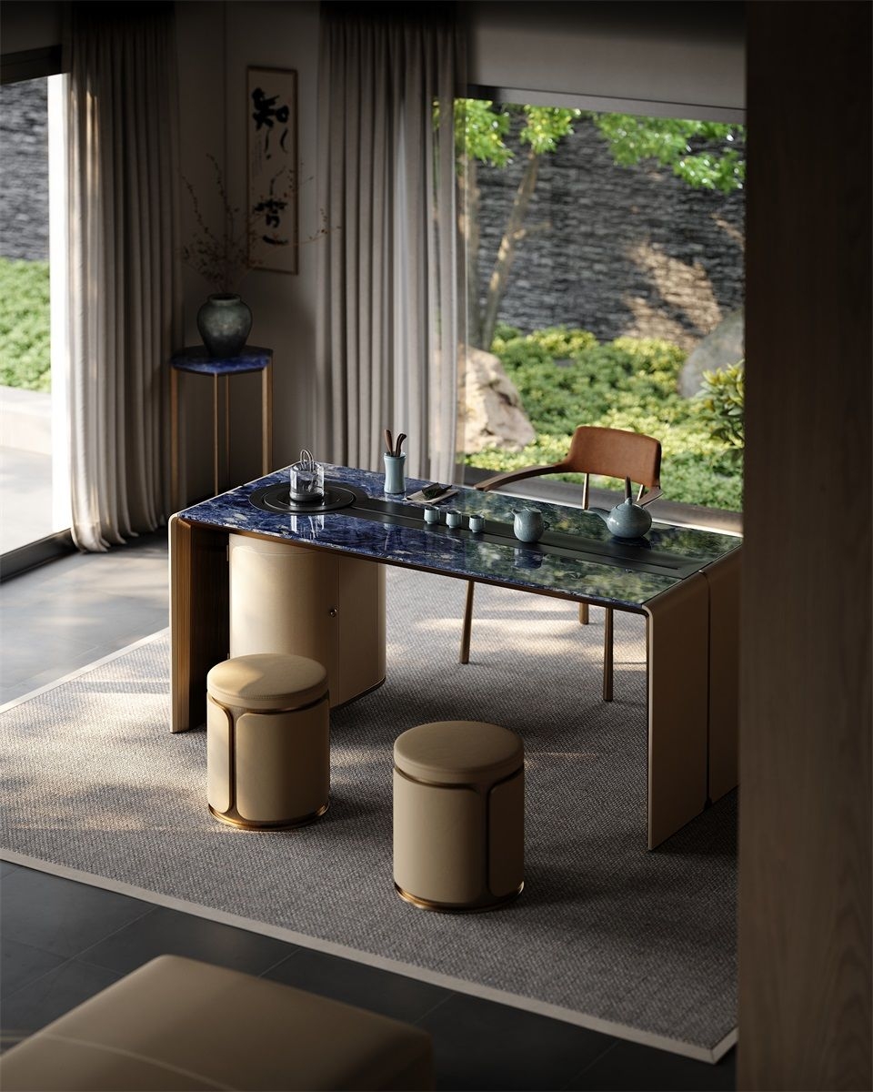 Without deliberately showing off, it has a kingly demeanor, making every return home like climbing to the top of Kunlun Mountain, feeling the magnificence and glory of China.Luxury Material Collocation:Blue marble tabletop, beige fabric - wrapped cabinets, and metal trim blend to create a high - end, elegant look.Smart Storage Integration:Built - in curved cabinet offers convenient storage for tea sets, keeping the space tidy.