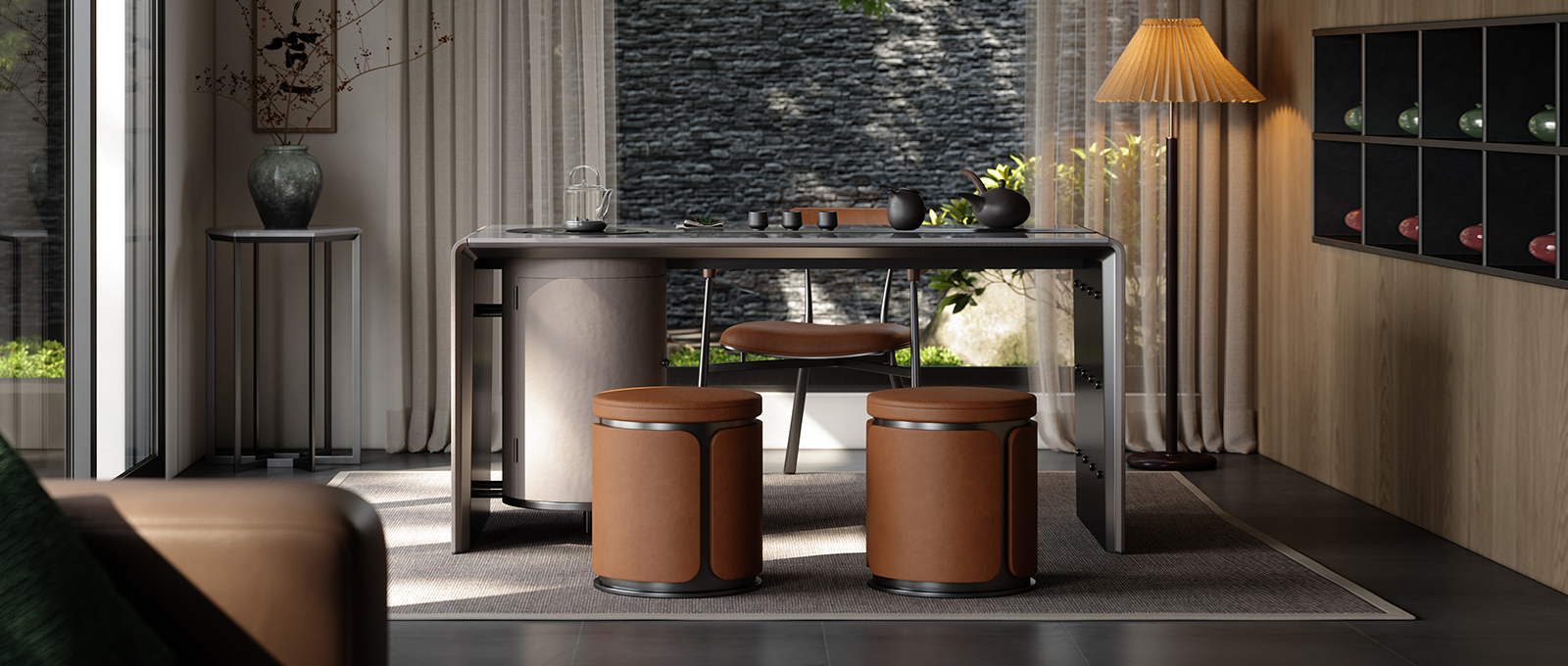The rounded corner design softens the edges of the space to prevent bumps, and the spacious desktop carries daily life, connecting each space with flowing curves.