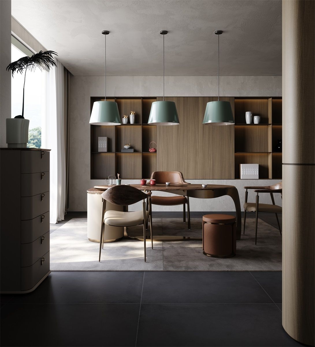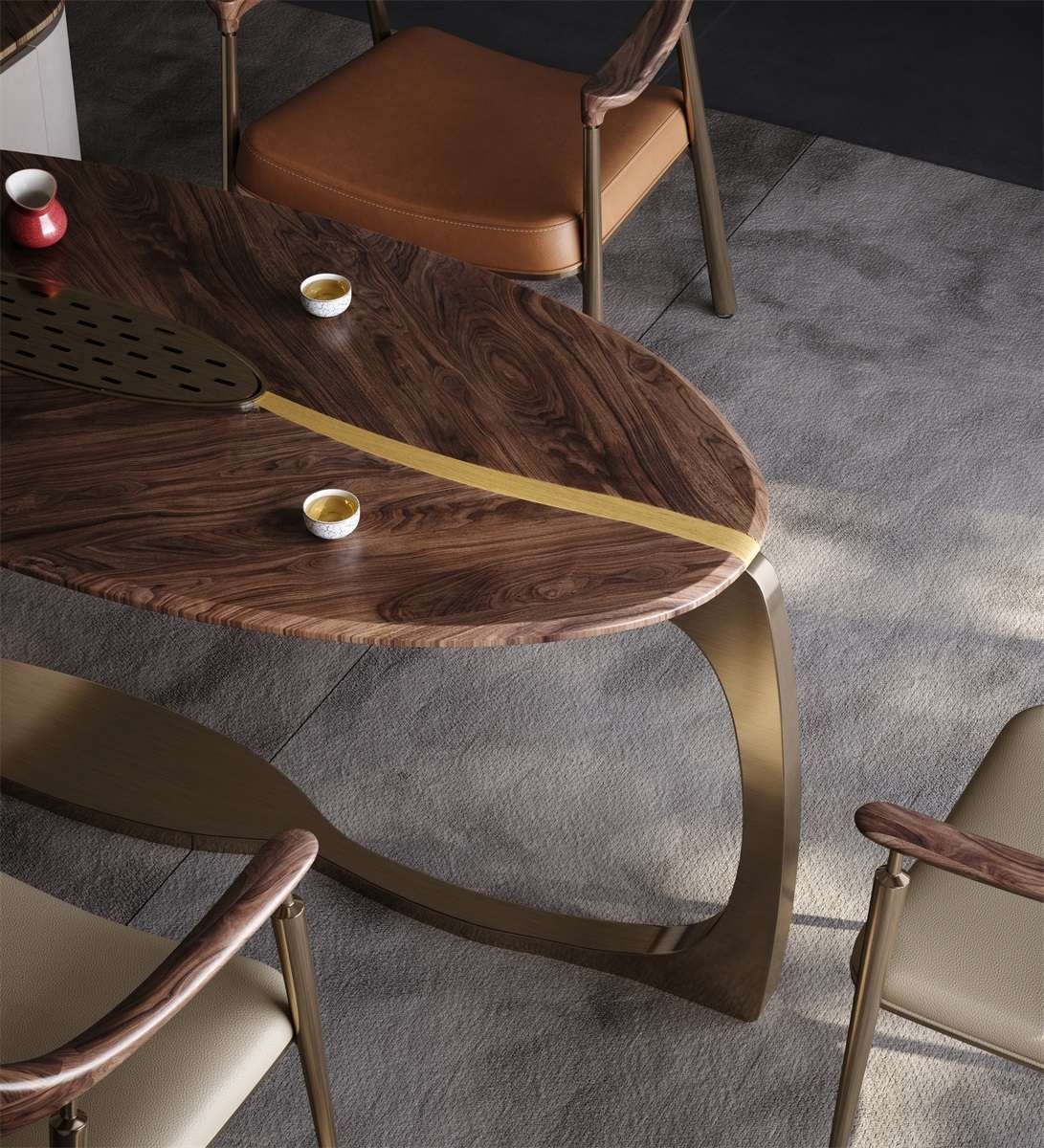 It symbolizes vitality and dedication, and can continue to grow no matter how harsh the environment is. The Leaf series interprets the tenacious vitality of all things, reminding people to be full of hope for the future.Unique, curved metal frame and organic - shaped wooden top create a sculptural, modern tea - tasting space.