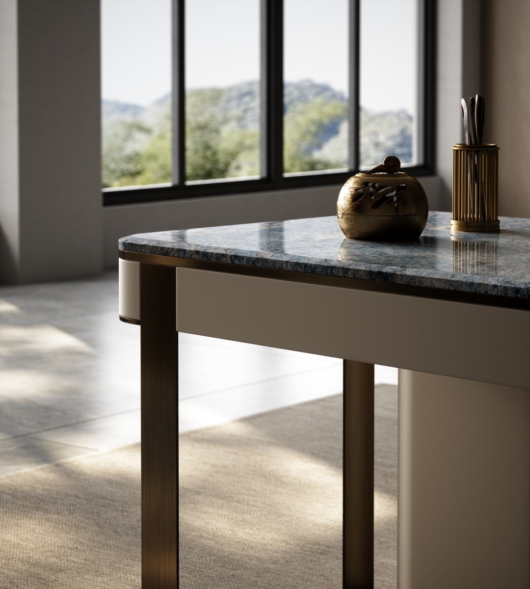 Borrowing a clear sky to bring life back to its original intention, reducing complexity to simplicity, is a wise attitude towards life.The set features sleek marble tops with intricate veining, paired with a polished metal frame in a warm bronze tone. This combination creates a striking visual contrast, exuding sophistication.