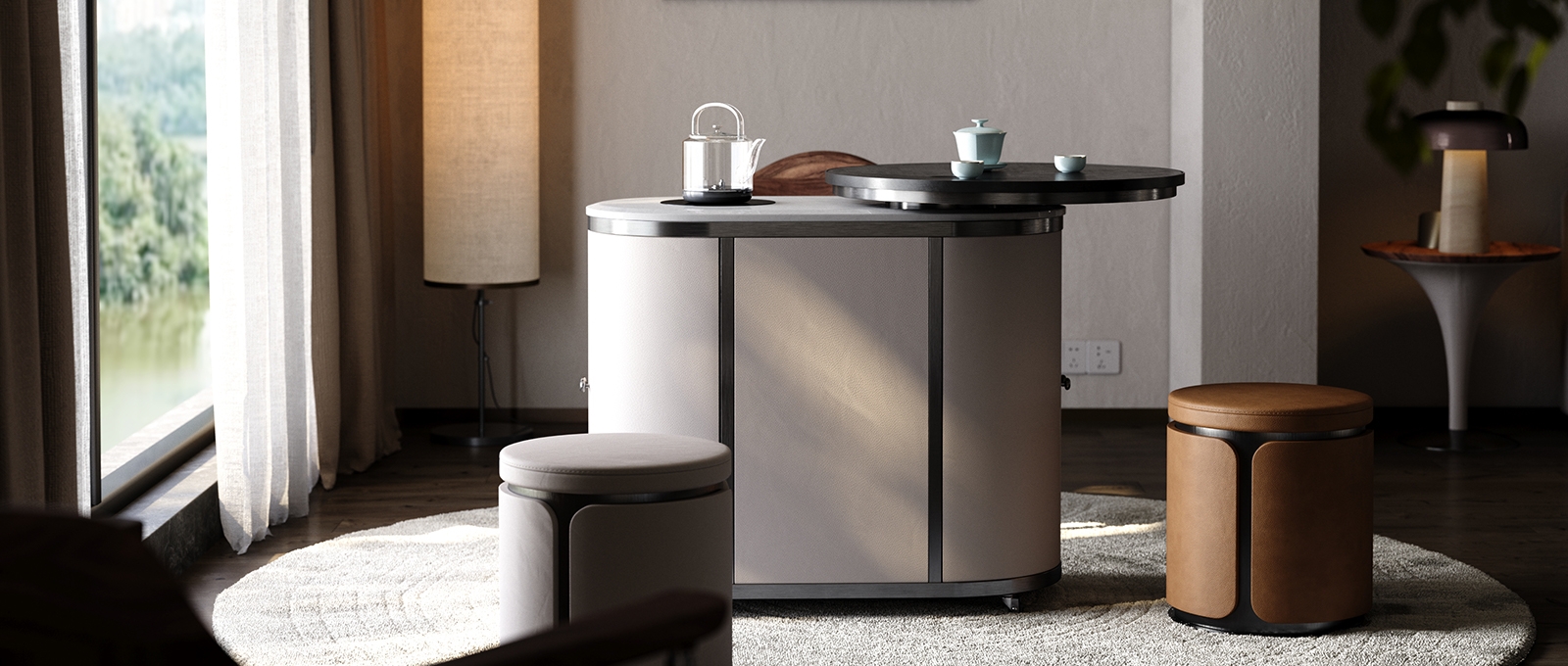 Compact Modern Silhouette: Features a sleek, rounded - edge design with a mix of neutral - tone panels and black accents. The rotating top shelf adds a dynamic, functional flair—perfect for small spaces or as a movable tea station in larger rooms.