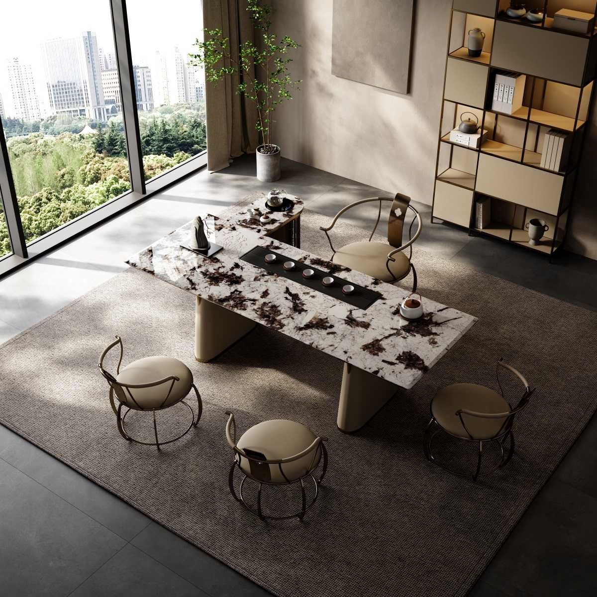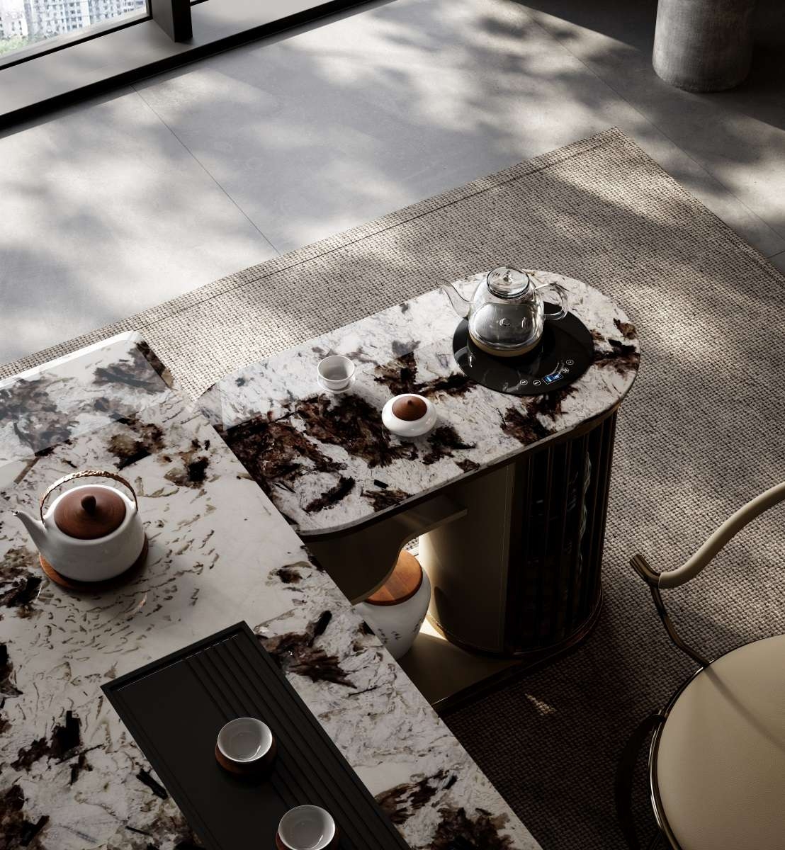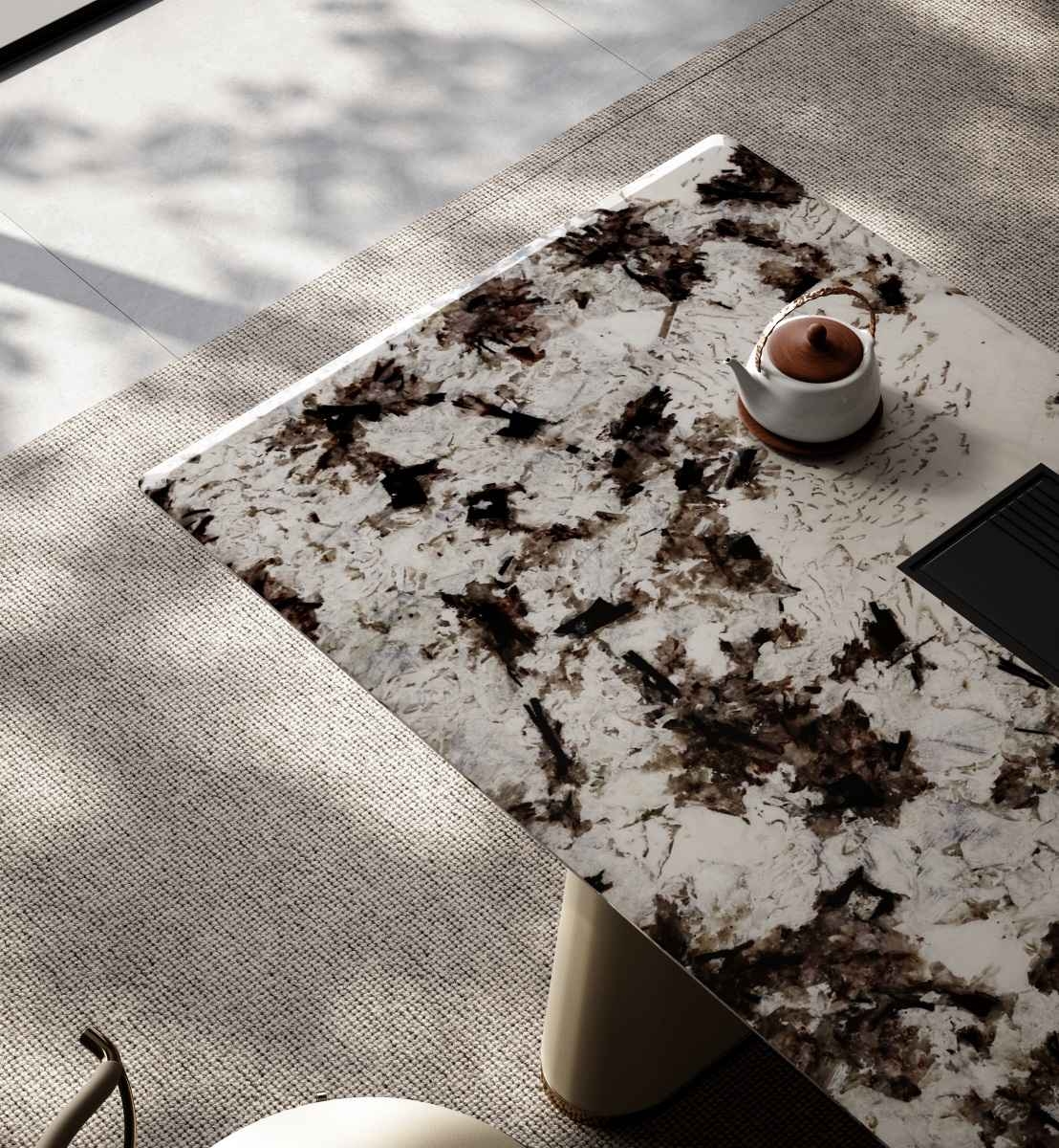 Consolidate the power of nature and merge with the world; The He series is also based on the consideration of Tianhe and human rationality, using symmetrical design techniques to achieve a perfect state.The dark, veined marble surface is a natural work of art. Its unique patterns add a touch of luxury, making every tea session feel special.