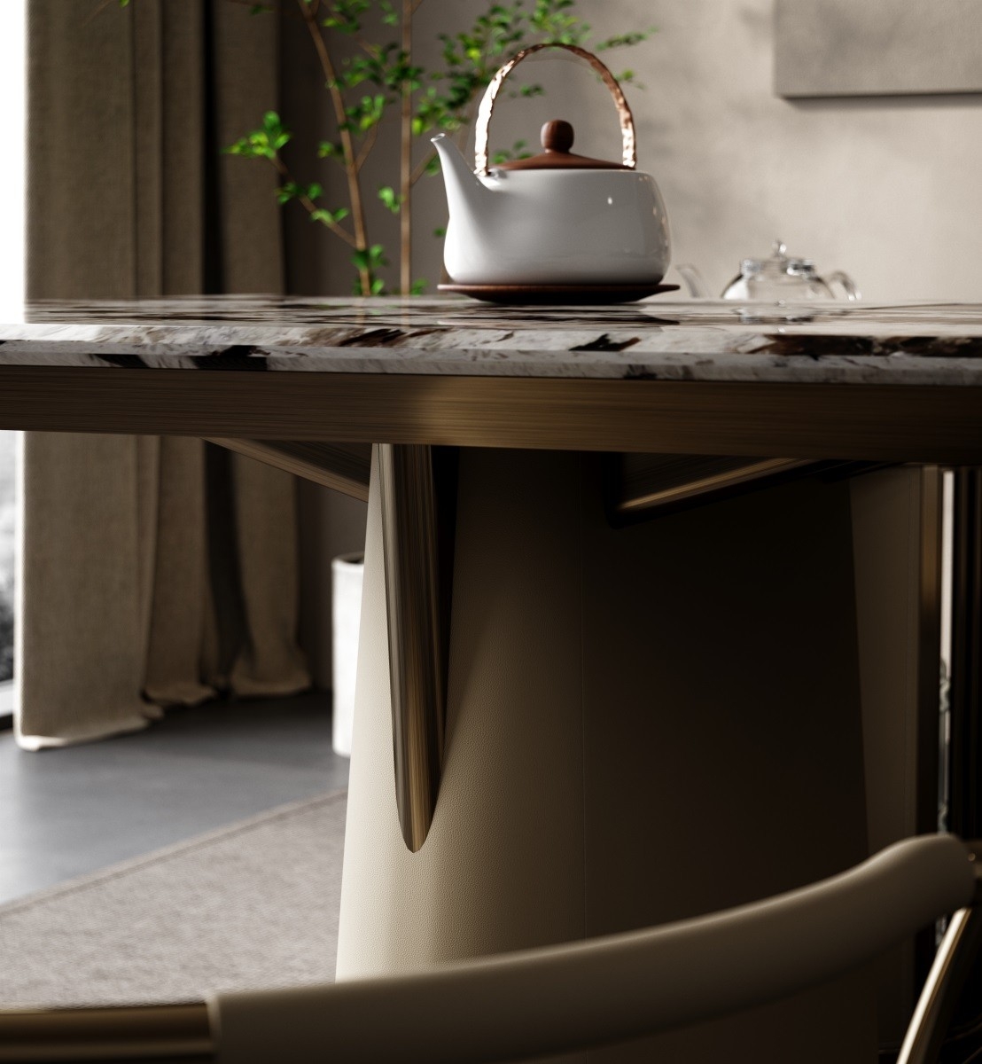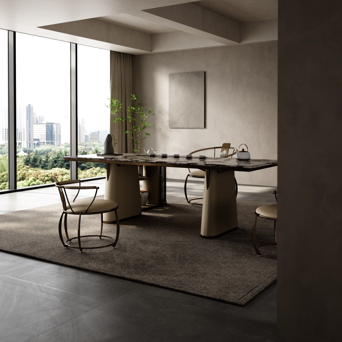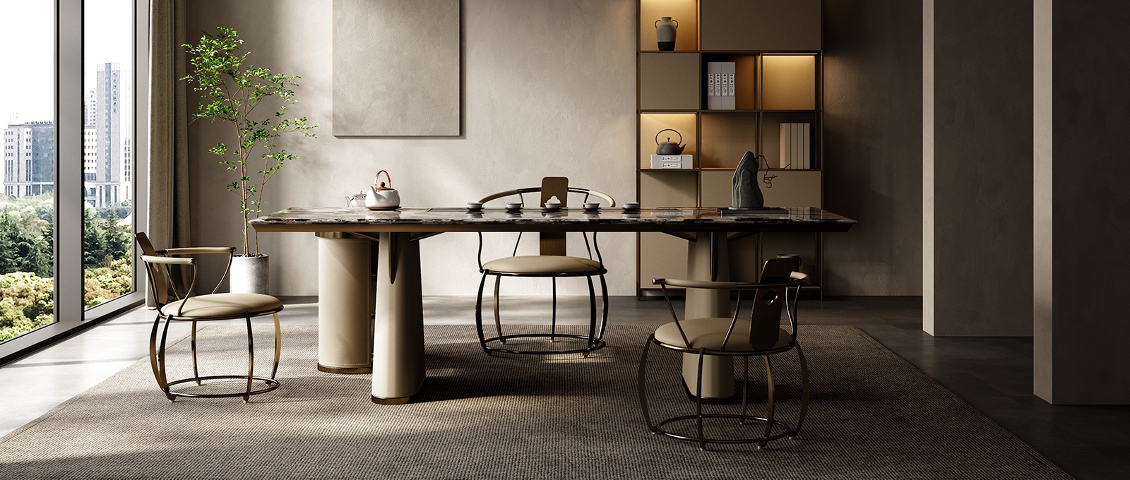 Consolidate the power of nature and merge with the world; The He series is also based on the consideration of Tianhe and human rationality, using symmetrical design techniques to achieve a perfect state.The dark, veined marble surface is a natural work of art. Its unique patterns add a touch of luxury, making every tea session feel special.