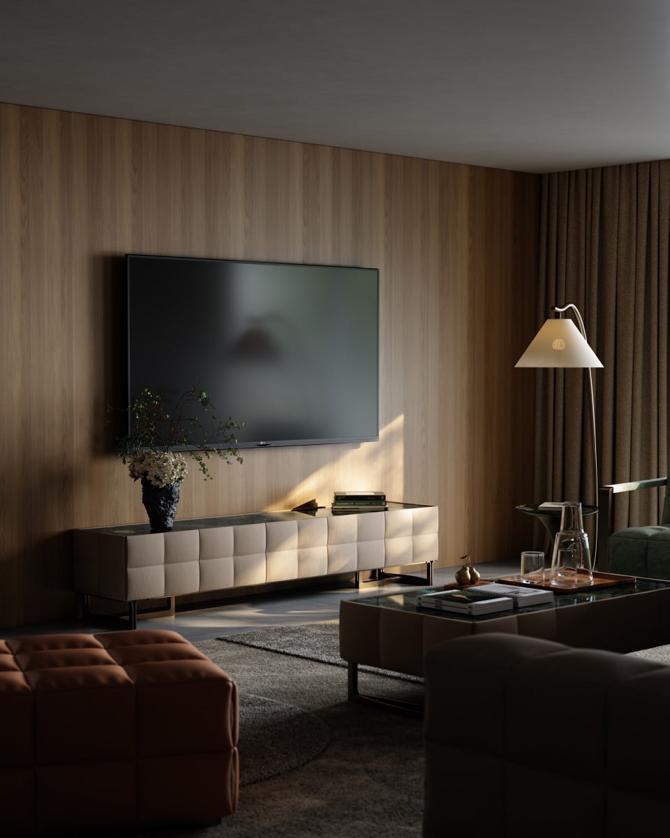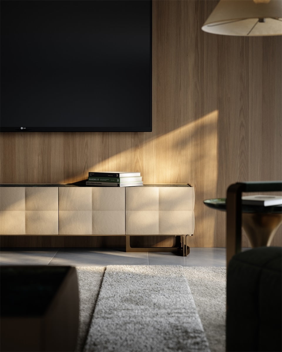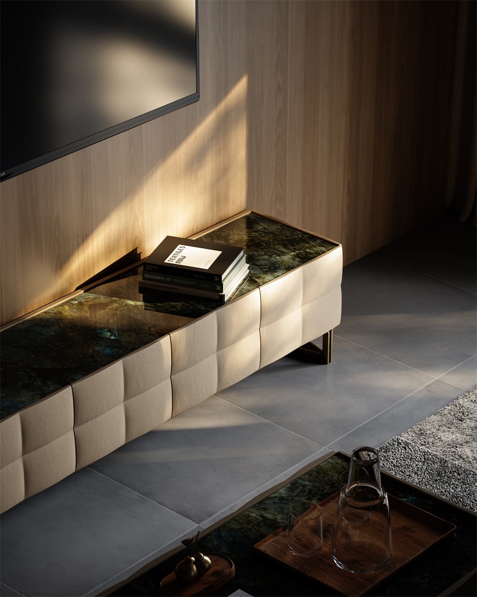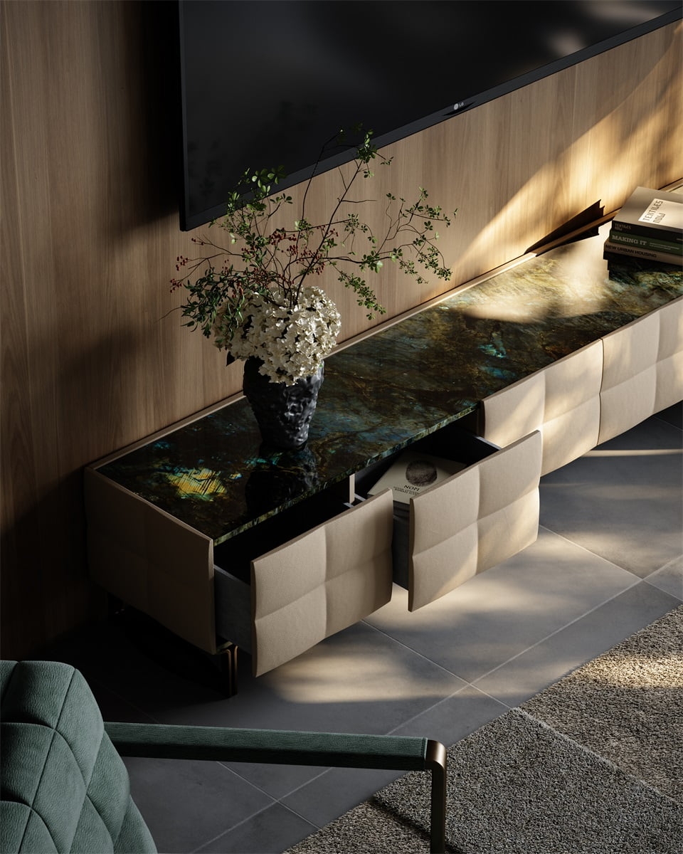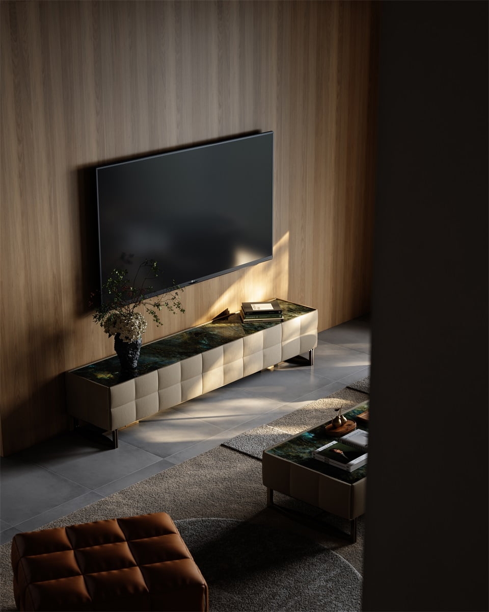 The square soft-padded cabinet + stone open countertop design breaks the stereotyped TV cabinet form. The open countertop displays decorations, and the soft-padded cabinet stores sundries to maintain a neat appearance; the combination of "soft-padded cabinet + metal bracket + stone countertop" not only meets the storage needs, but also creates a sense of lightness visually, allowing the living room to bid farewell to clutter and return to an exquisite and healing rest area.