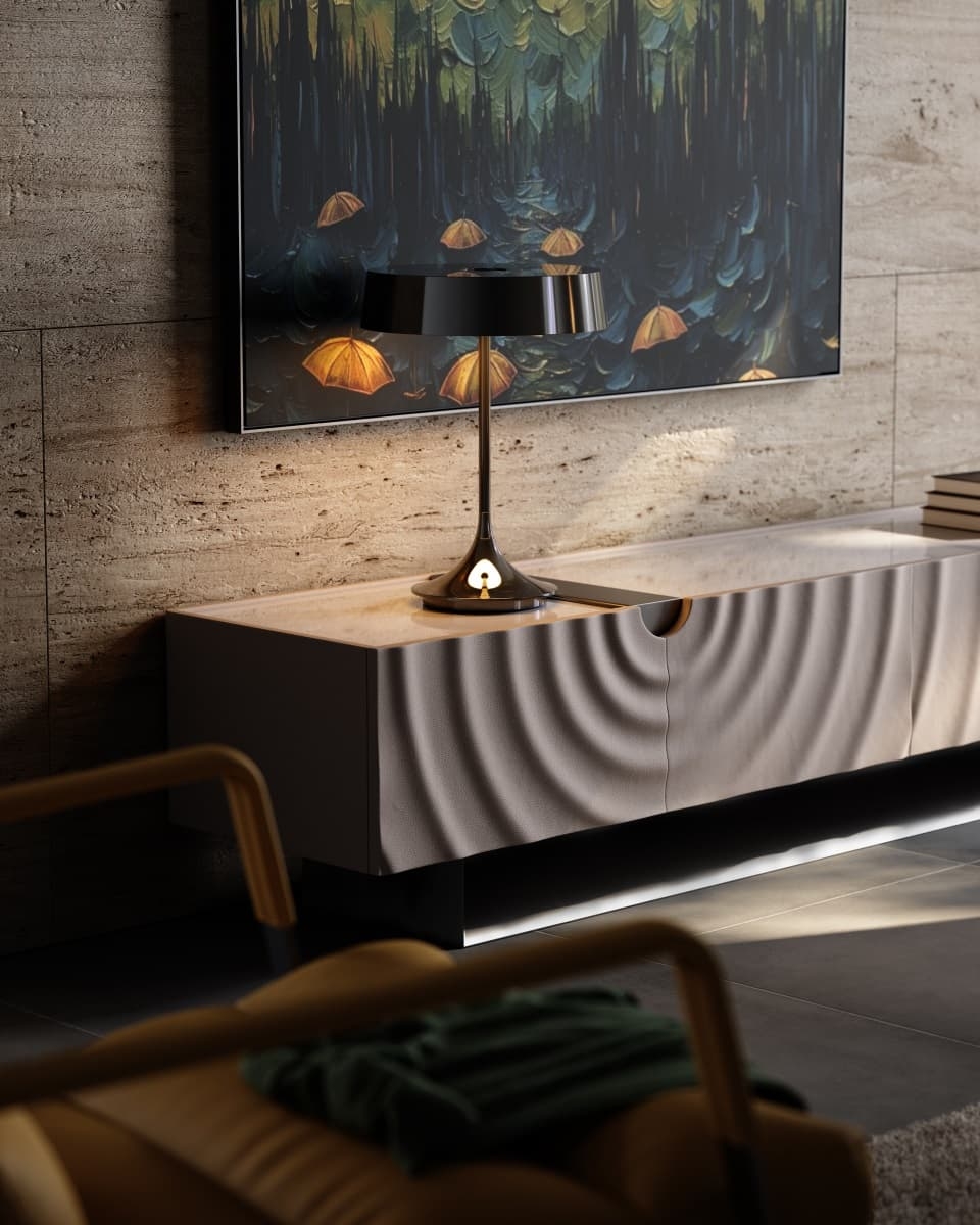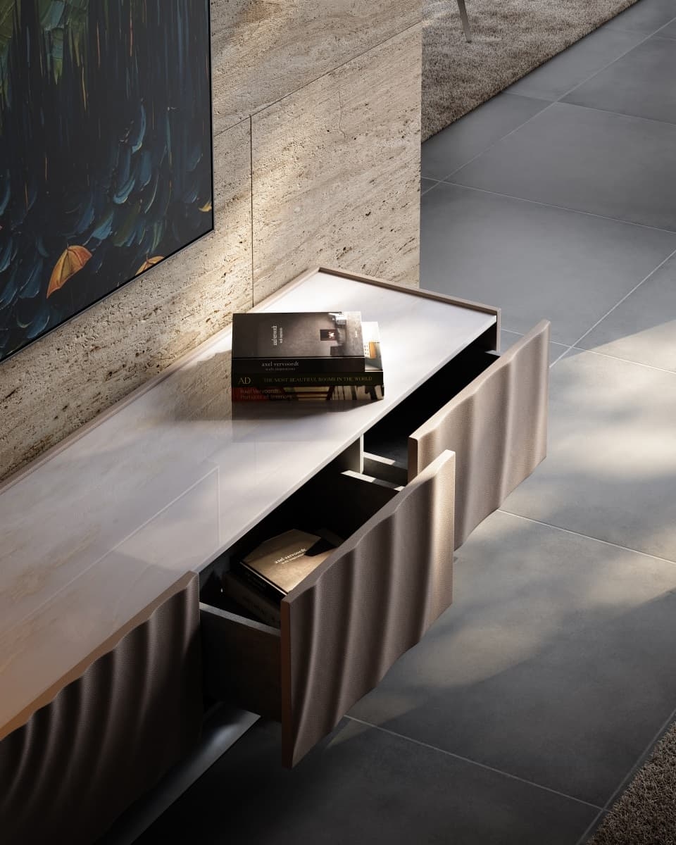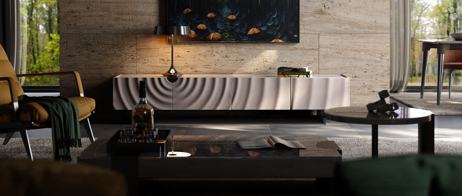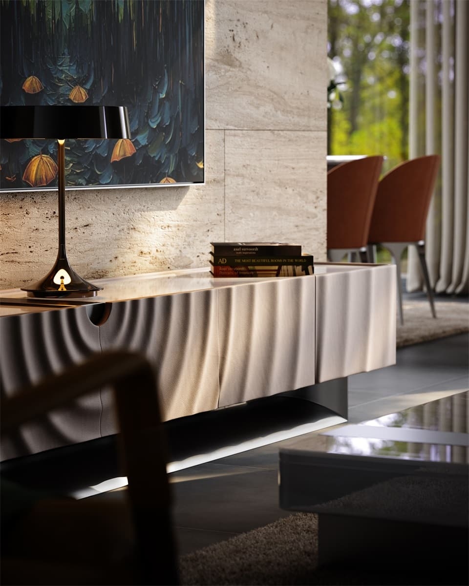 The cabinet body uses a three-dimensional corrugated design, breaking the stereotyped form of traditional TV cabinets and giving the space dynamic artistic tension; the unified silver-gray tone is matched with a black base, weaving a high-end texture base and injecting a fashionable atmosphere into the living room.