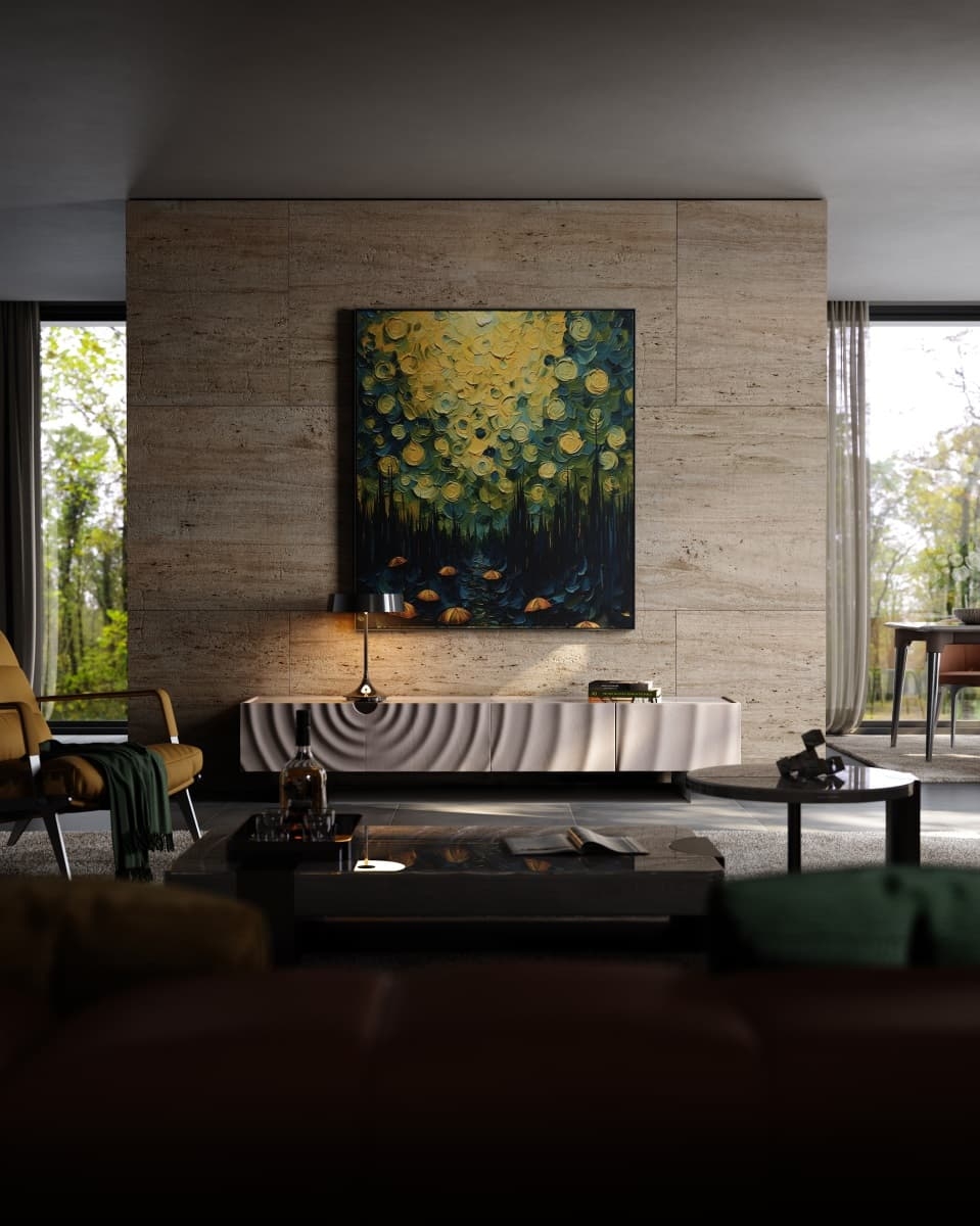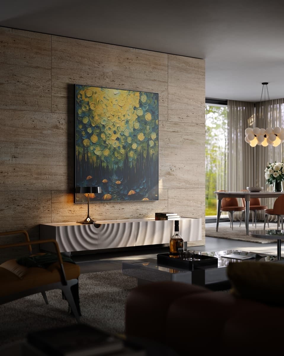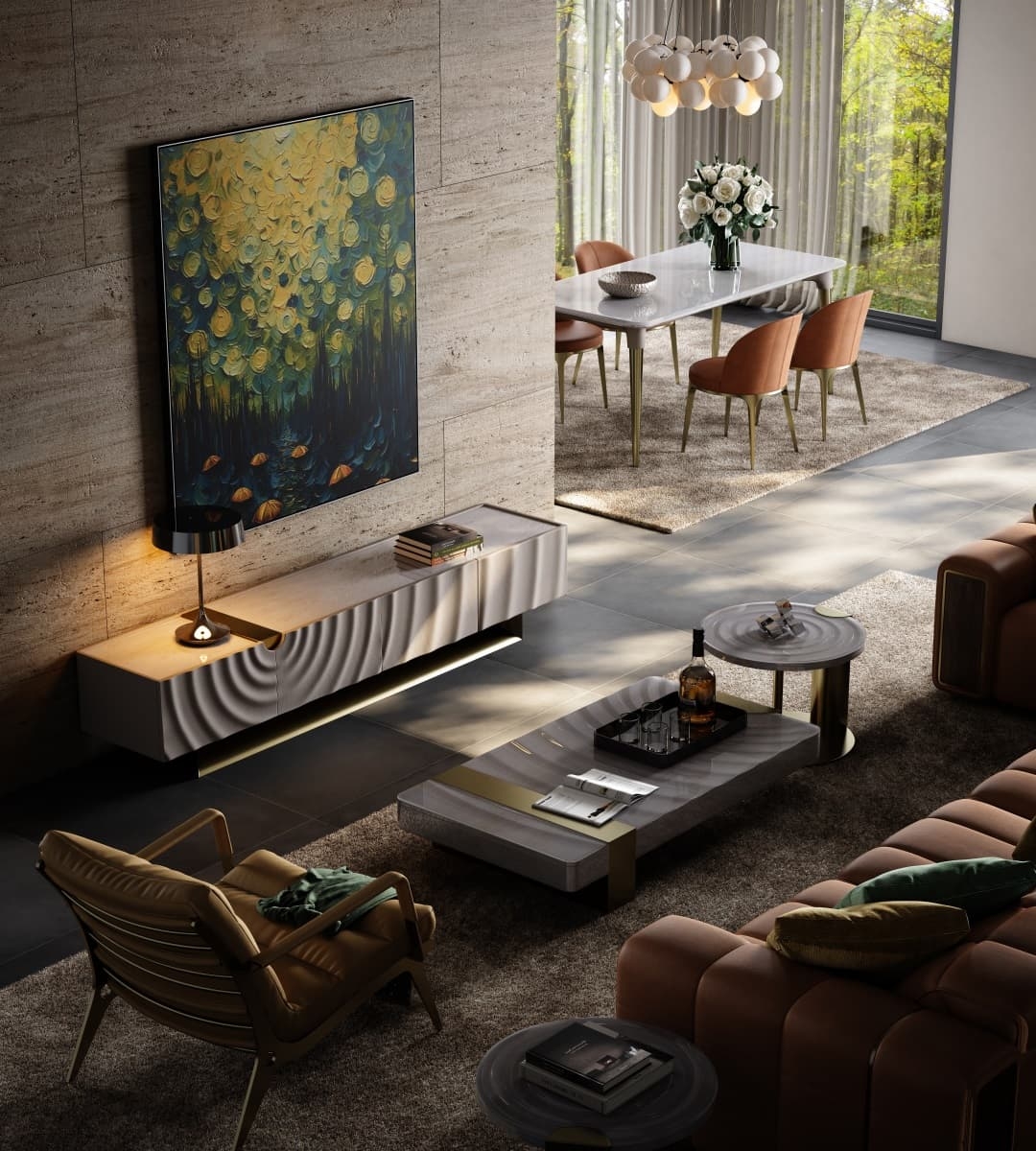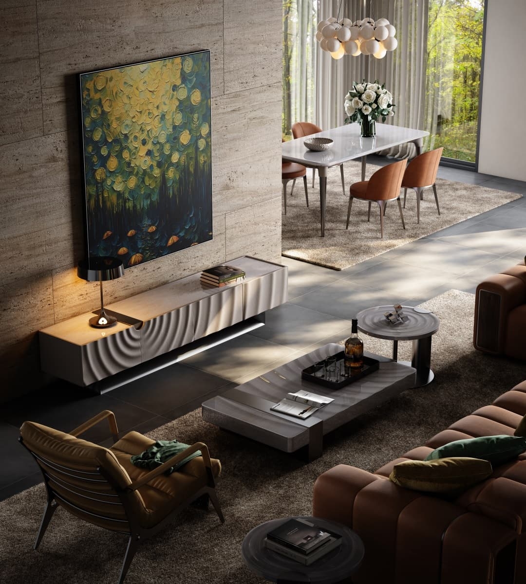 The cabinet body uses a three-dimensional corrugated design, breaking the stereotyped form of traditional TV cabinets and giving the space dynamic artistic tension; the unified silver-gray tone is matched with a black base, weaving a high-end texture base and injecting a fashionable atmosphere into the living room.