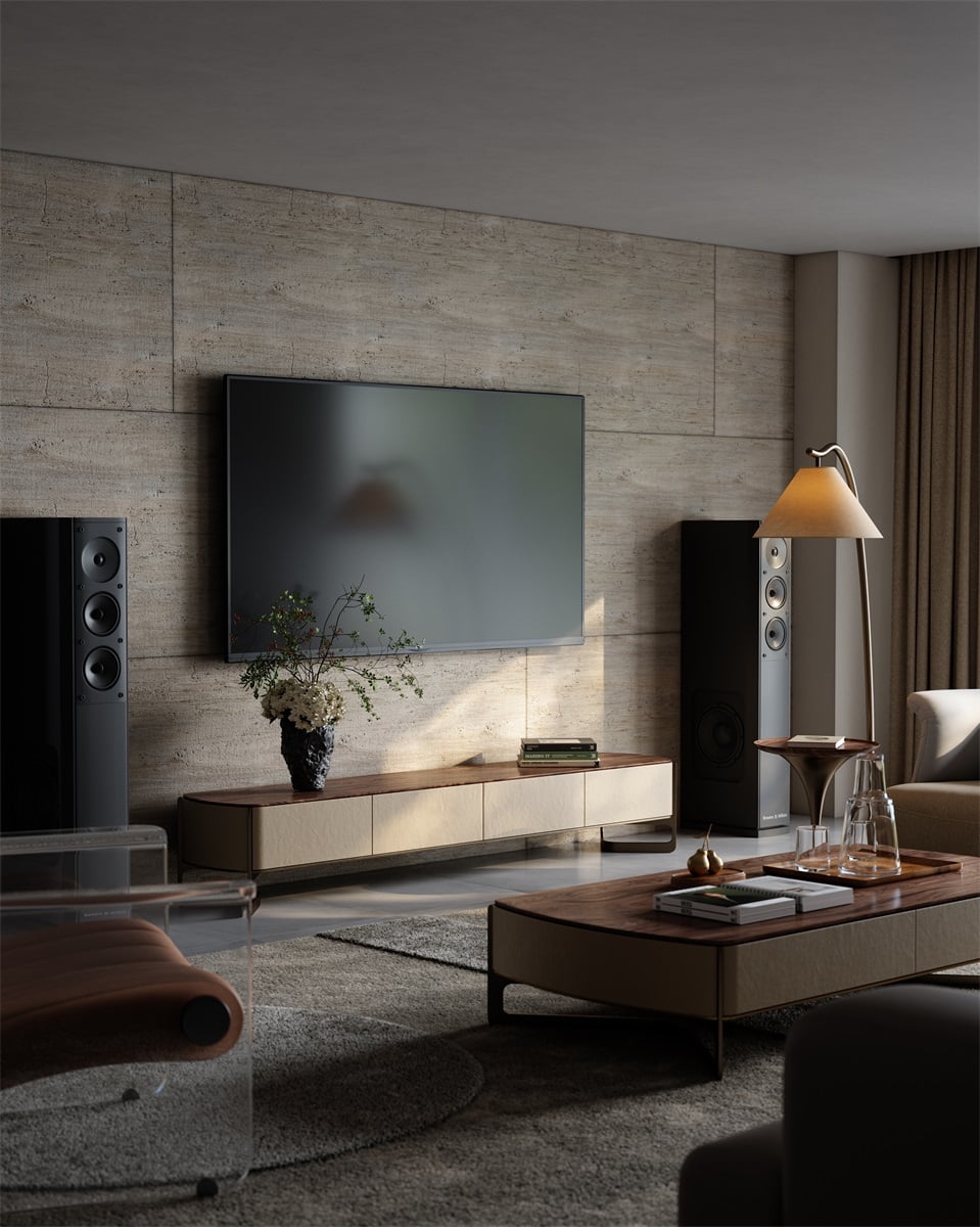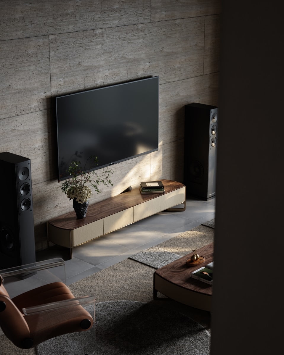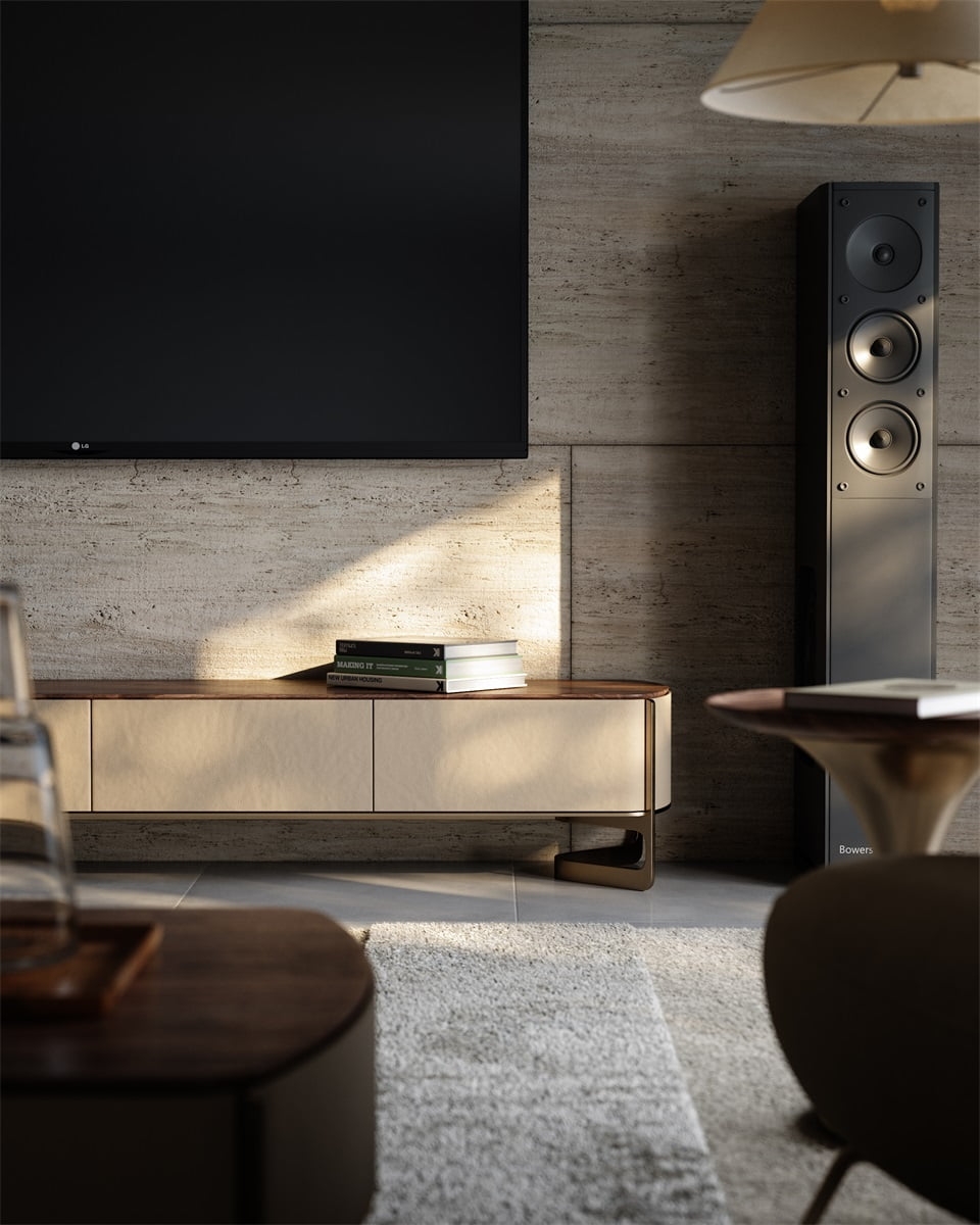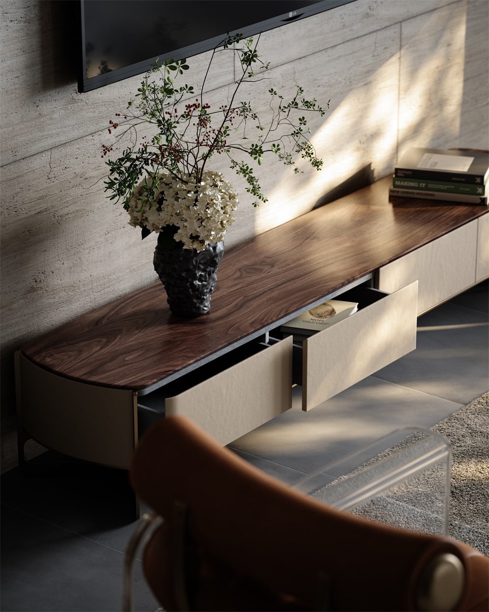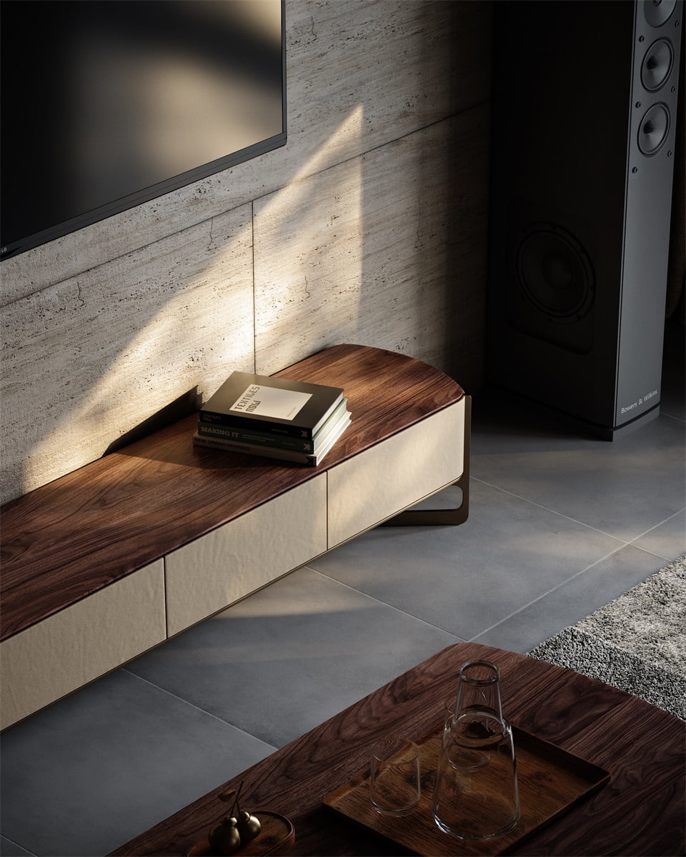 In a home scene that focuses on living room storage and spatial aesthetics, this TV cabinet combines solid wood, leather, and metal materials with a multi-drawer design, becoming the "order center" of the living room, allowing books and audio-visual equipment to be placed in order, turning it into a healing experience of embracing quality life.