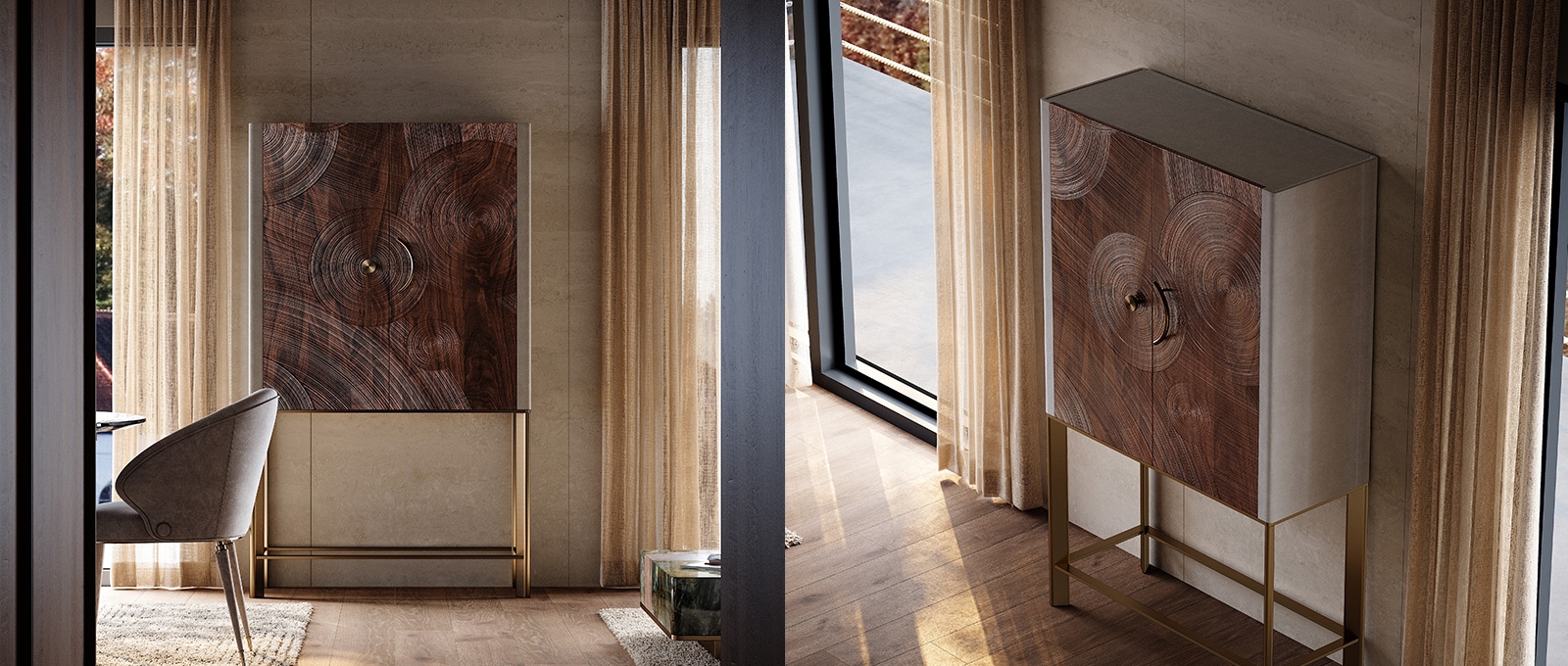 Clean, flowing lines define the collection area. The tabletop combines solid wood and natural stone,